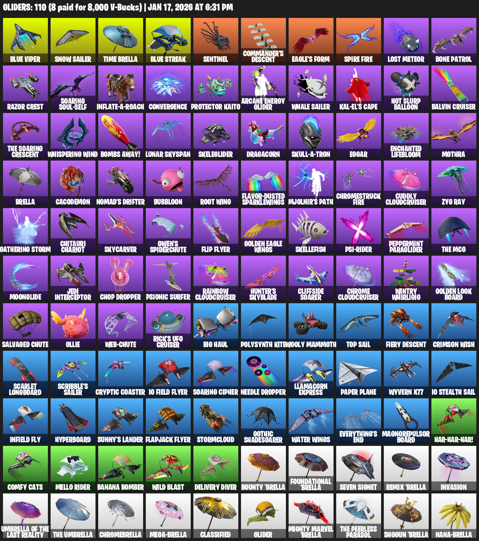 Snow Sailer, Time Brella, Sentinel, Commander’s Descent, Eagle’s Form, Spire Fire, Lost Meteor, Bone Patrol, Razor Crest, Soaring Soul-Self, Inflate-A-Roach, Convergence, Protector Kaito, Kal-El’s Cape, Hot Slurp Balloon, Balvin Cruiser