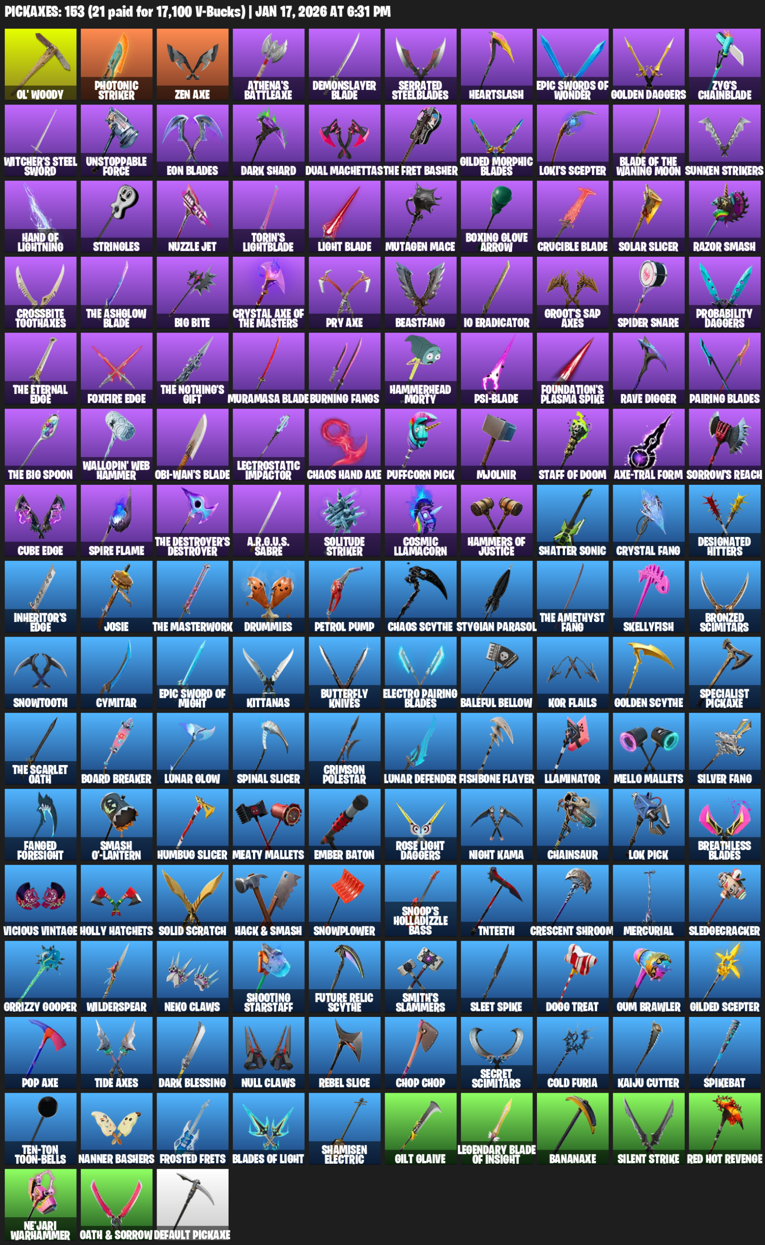 Ol’ Woody, Photonic Striker, Zen Axe, Athena’s Battleaxe, Demonslayer Blade, Serrated Steelblades, Heartslash, Golden Daggers, Zyg’s Chainblade, Witcher’s Steel Sword, Unstoppable Force, Eon Blades, Dark Shard, Dual Machettas, Loki’s Scepter, Sunken Strikers