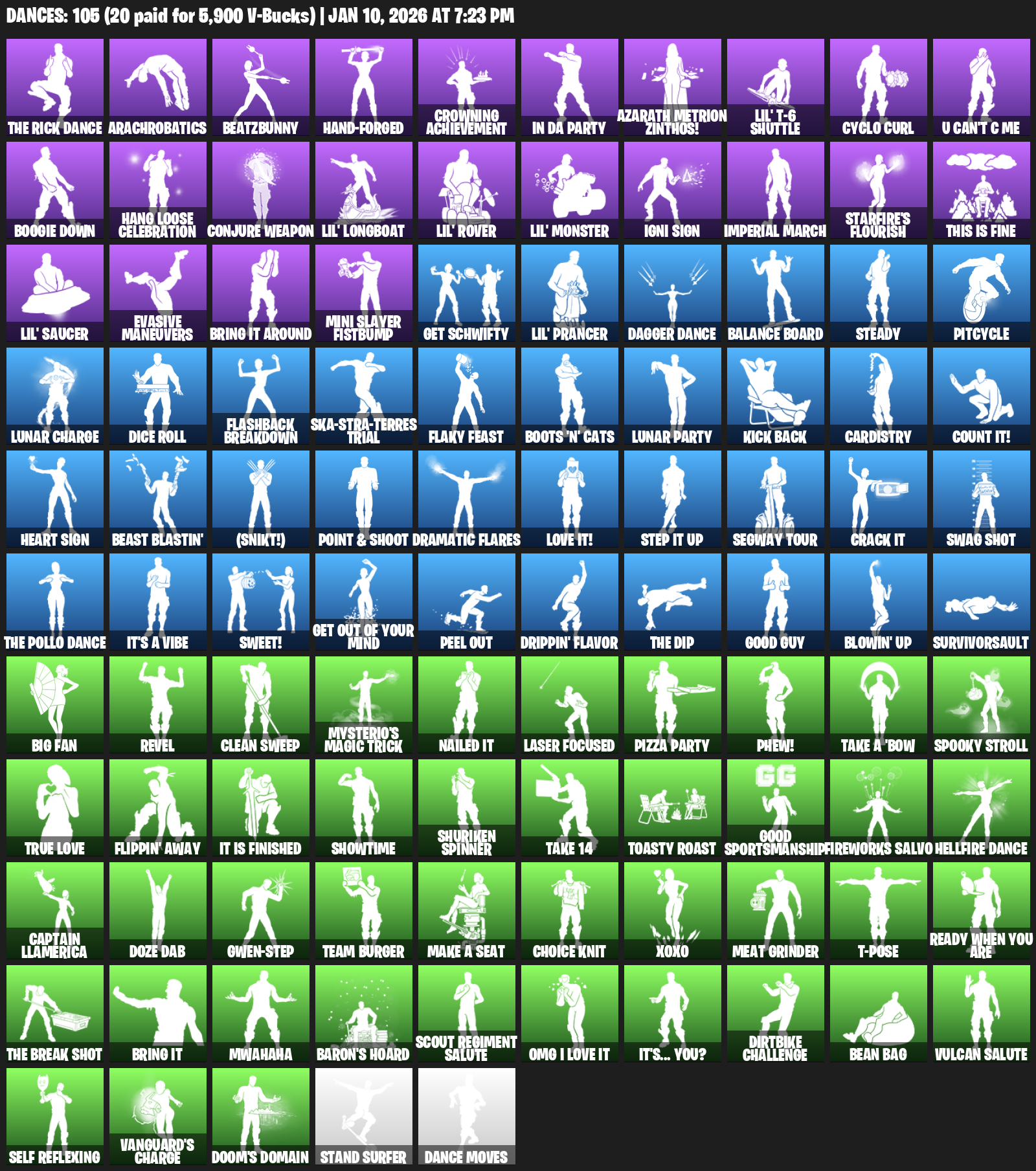 Arachrobatics, BeatzBunny, Hand-Forged, Crowning Achievement, In Da Party, Azarath Metrion Zinthos!, Lil’ T-6 Shuttle, Cyclo Curl, U Can’t C Me, Boogie Down, Hang Loose Celebration, Conjure Weapon, Igni Sign, Imperial March, Starfire’s Flourish, This is Fine