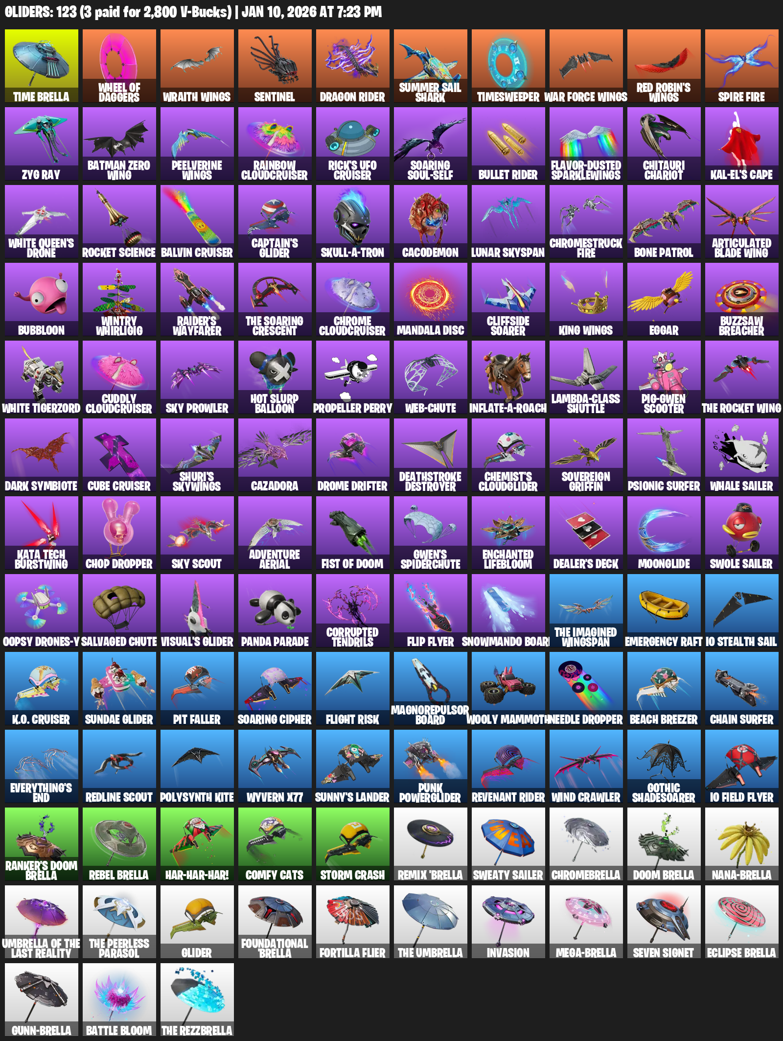 Time Brella, Wheel of Daggers, Wraith Wings, Sentinel, Dragon Rider, Summer Sail Shark, Timesweeper, Zyg Ray, Batman Zero Wing, Rainbow Cloudcruiser, Rick’s UFO Cruiser, Soaring Soul-Self, Flavor-Dusted Sparklewings, Chitauri Chariot, Kal-El’s Cape