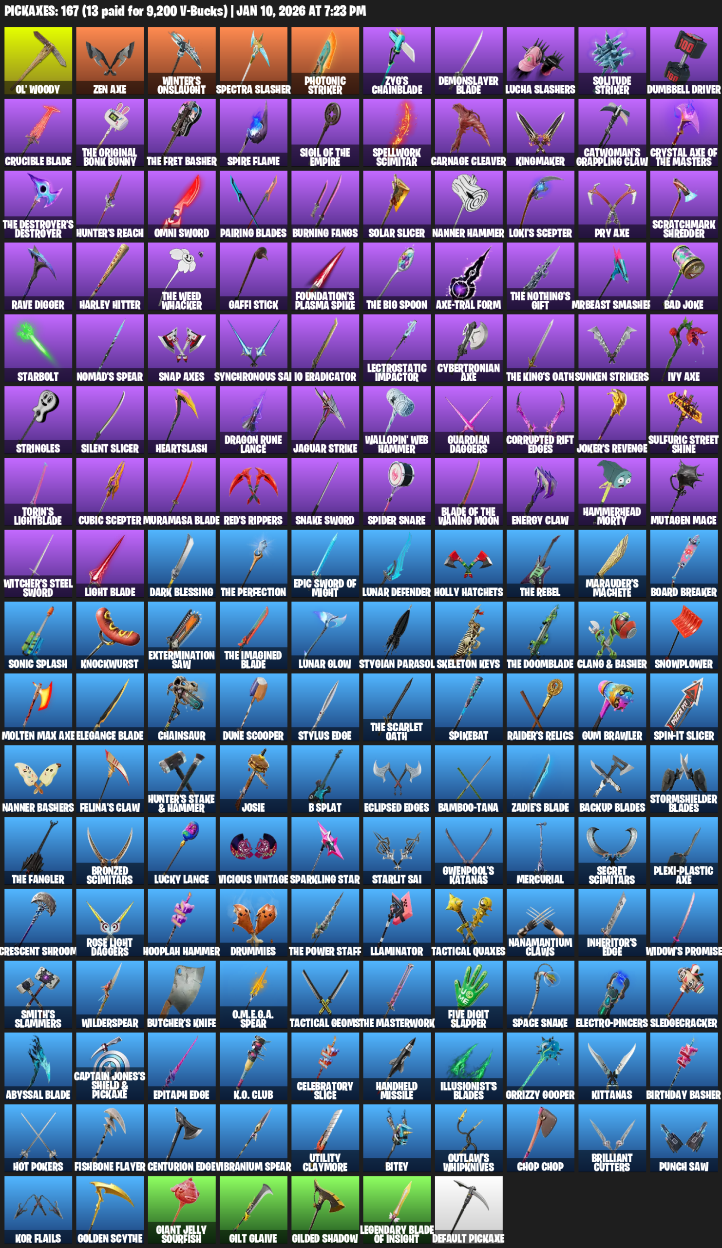 Ol’ Woody, Zen Axe, Winter’s Onslaught, Photonic Striker, Zyg’s Chainblade, Demonslayer Blade, Lucha Slashers, Dumbbell Driver, Spellwork Scimitar, Carnage Cleaver, Kingmaker, Catwoman’s Grappling Claw