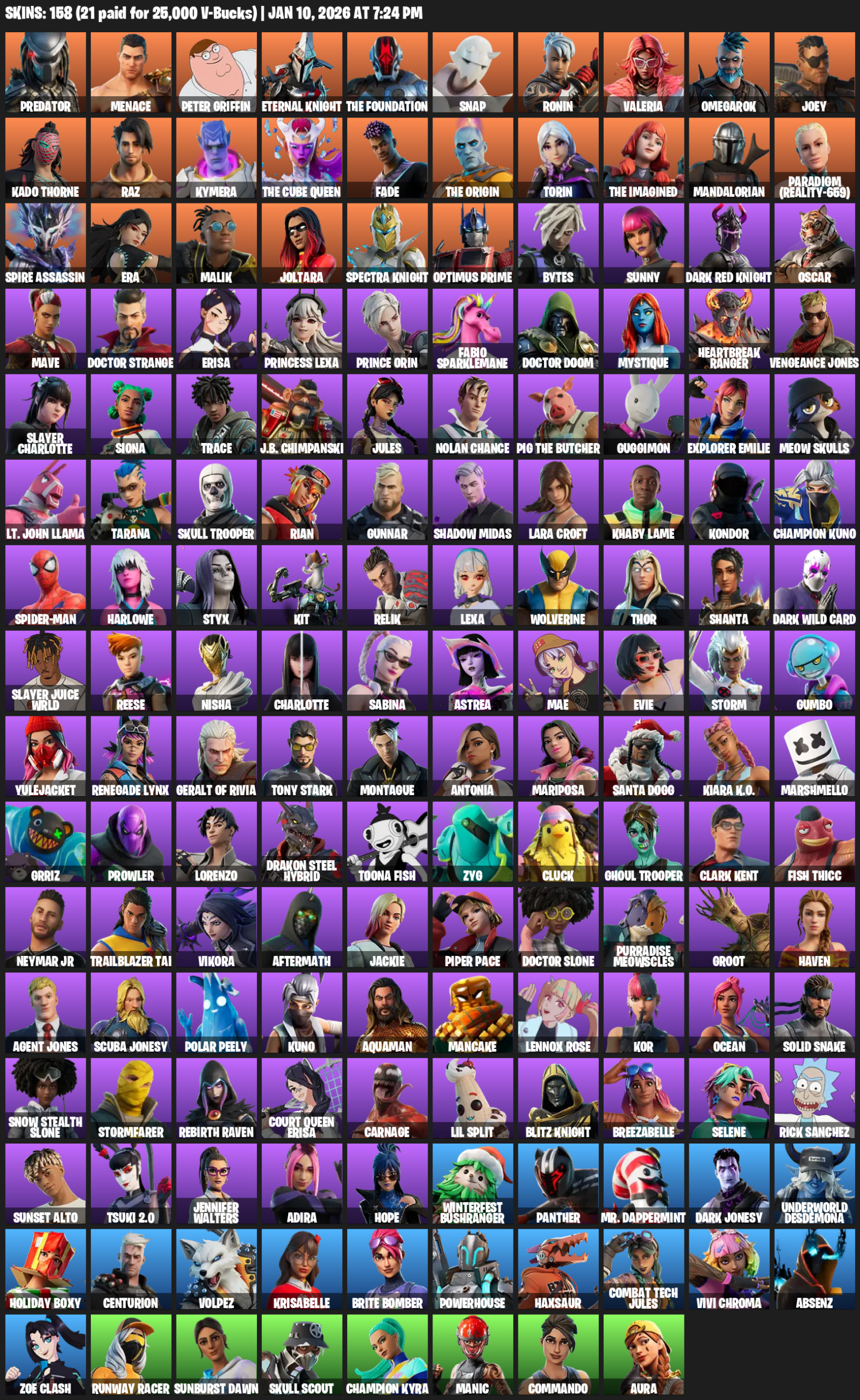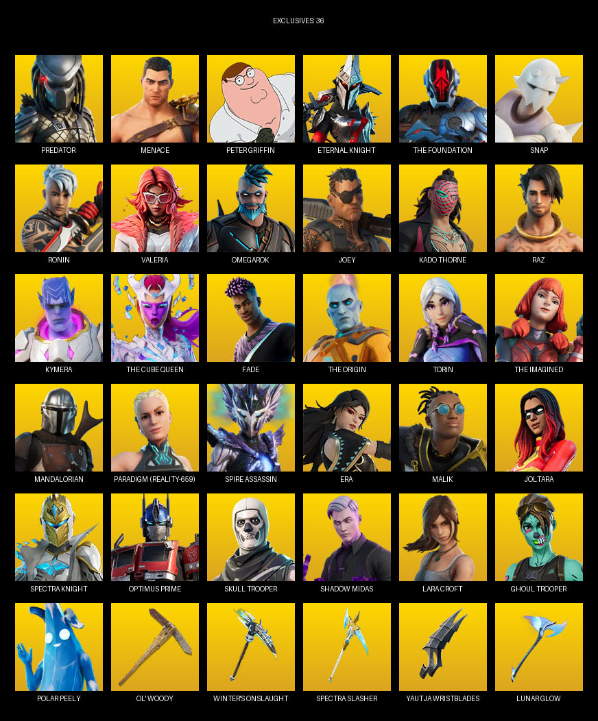 Lara Croft, Predator, Menace, Peter Griffin, Eternal Knight, The Foundation, Snap, Ronin, Valeria, Omegarok, Joey, Kado Thorne, Raz, Kymera, Fade, Torin, Mandalorian