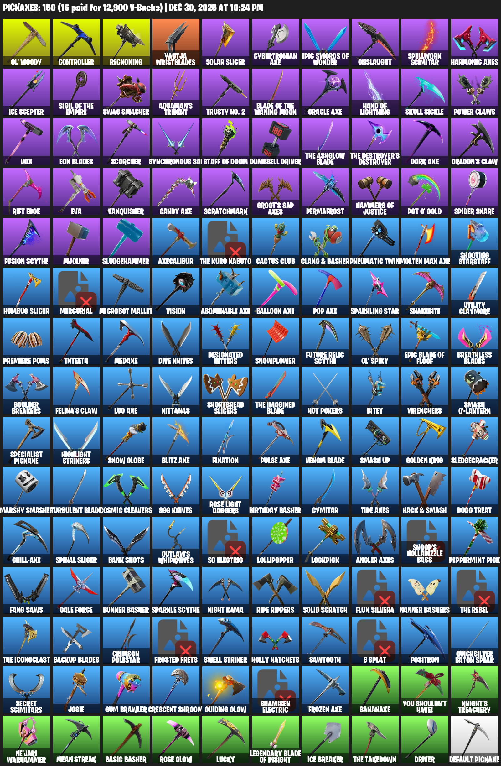 Ol’ Woody, Controller, Reckoning, Yautja Wristblades, Solar Slicer, Cybertronian Axe, Onslaught, Spellwork Scimitar, Harmonic Axes, Ice Scepter, Swag Smasher, Aquaman’s Trident, Trusty No. 2, Hand of Lightning, Skull Sickle, Power Claws