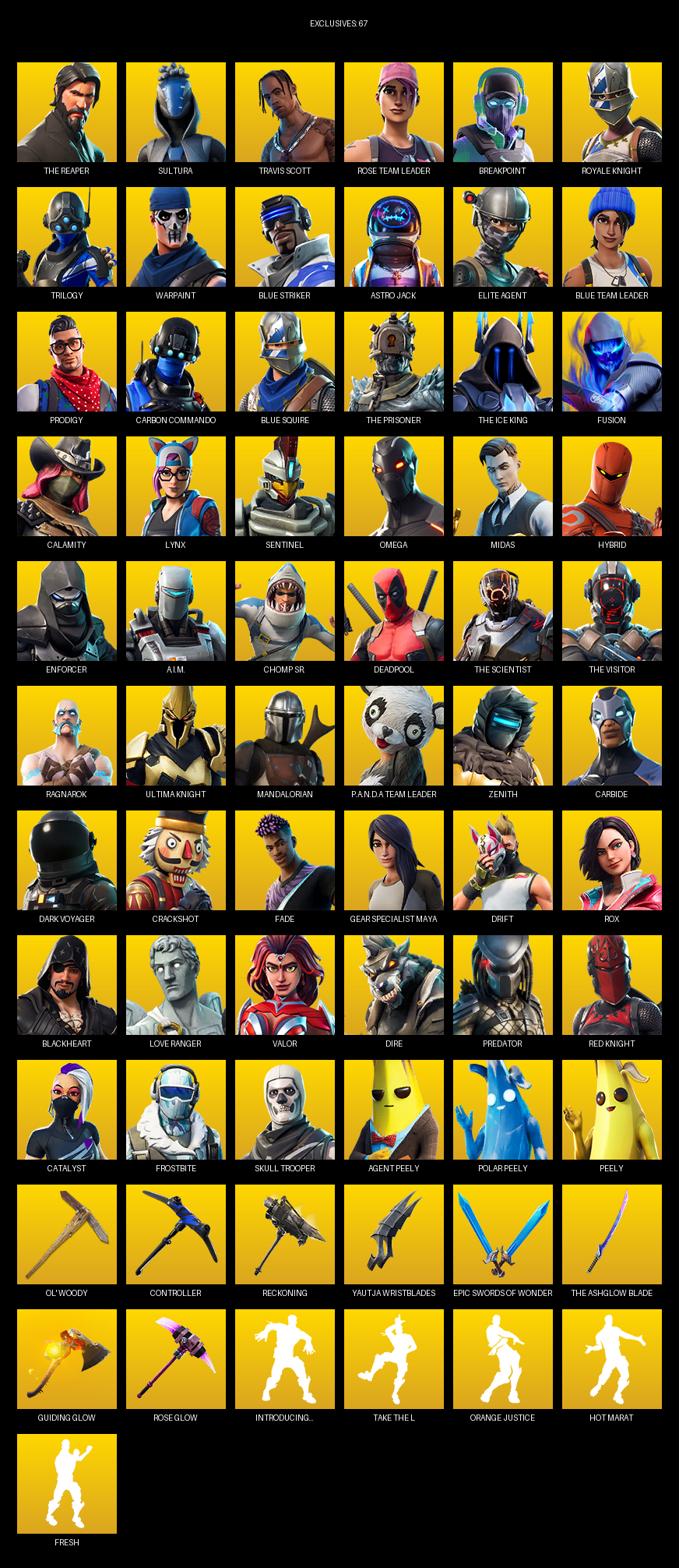 The Reaper, Travis Scott, Royale Knight, Elite Agent, Blue Squire, Omega, Gear Specialist Maya, Sultura, Rose Team Leader, Breakpoint, Trilogy, Warpaint, Astro Jack, Prodigy, Carbon Commando, Fusion