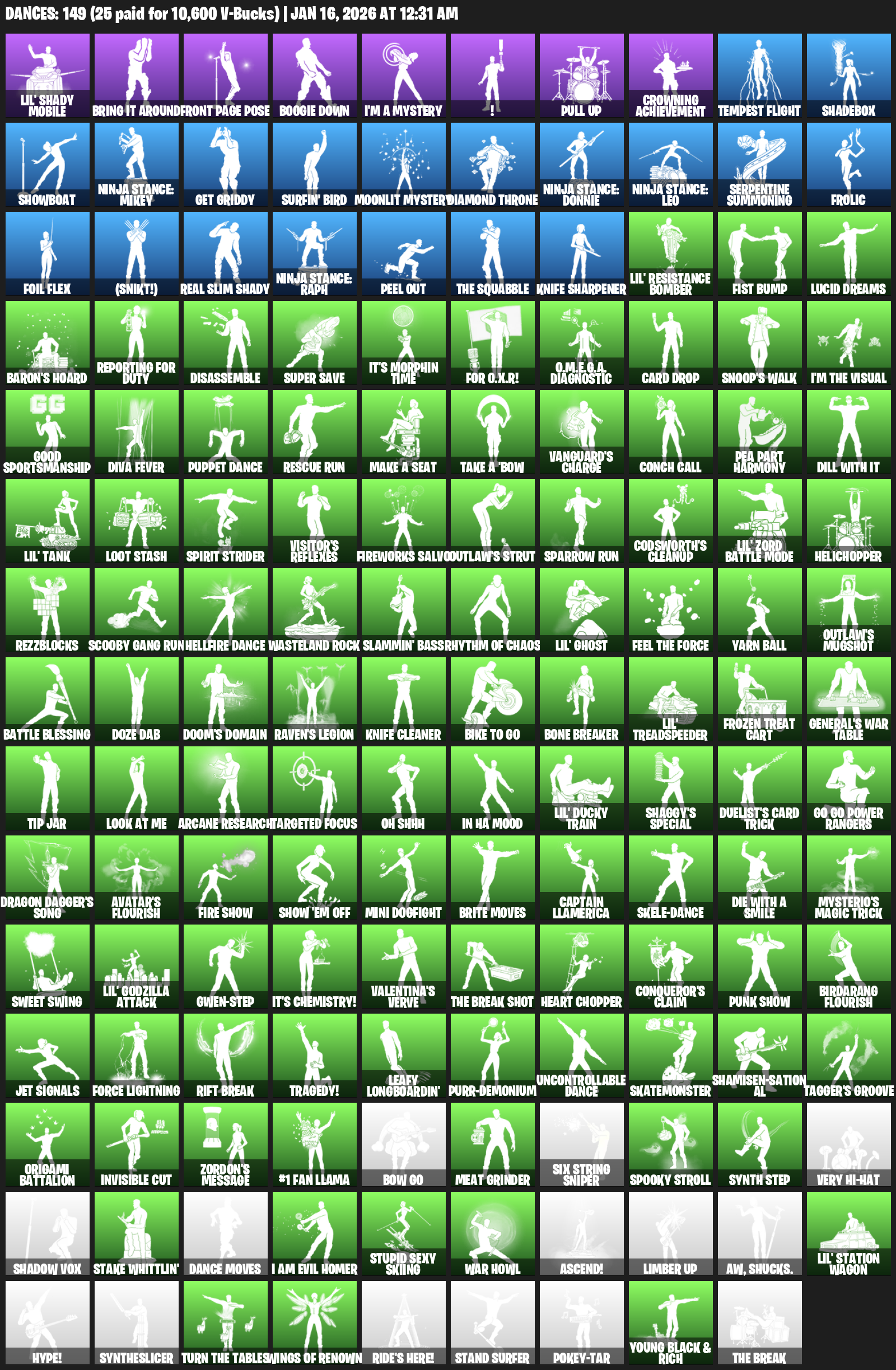 Bring it around, Front Page Pose, Boogie Down, !, Pull Up, Crowning Achievement, Tempest Flight, Shadebox, Showboat, Ninja Stance: Mikey, Get Griddy, Surfin’ Bird, Moonlit Mystery, Diamond Throne, Serpentine Summoning, Frolic