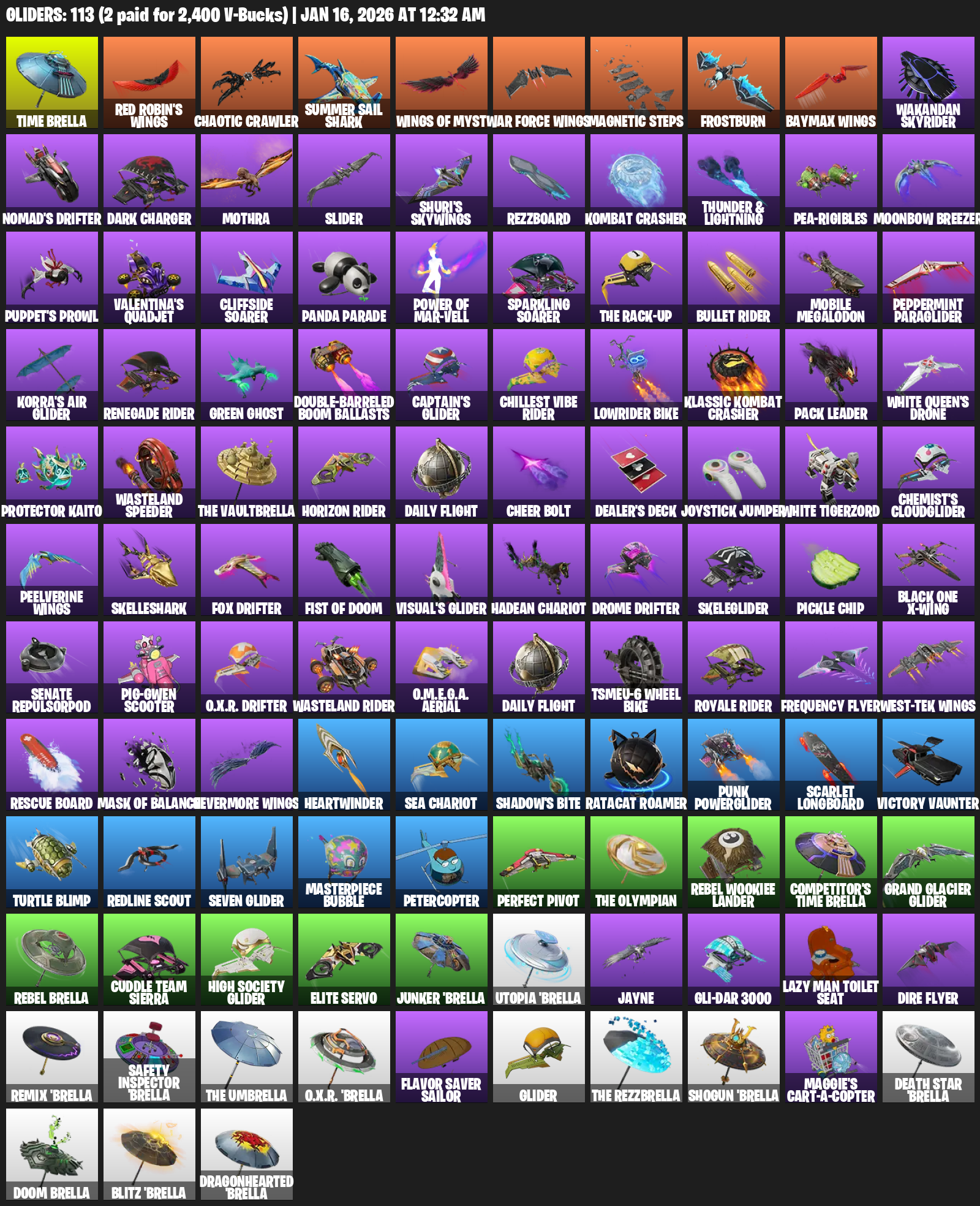 Time Brella, Red Robin’s Wings, Chaotic Crawler, Summer Sail Shark, Magnetic Steps, Frostburn, Wakandan Skyrider, Nomad’s Drifter, Dark Charger, Mothra, Slider, Shuri’s Skywings, Rezzboard, Kombat Crasher, Thunder & Lightning, Pea-rigibles, Moonbow Breezer