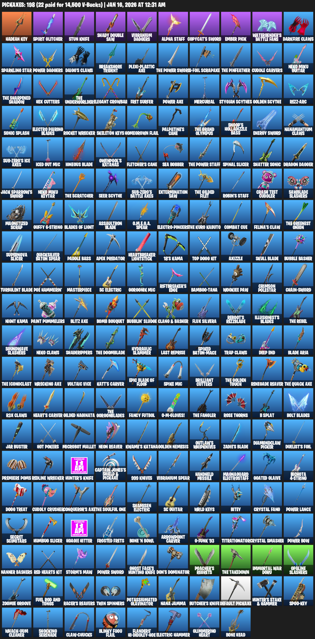 Hadean Key, Spirit Glitcher, Stun Knife, Vibranium Daggers, Alpha Staff, Copycat’s Sword, Ember Pick, Waterbender’s Battle Fans, Darkfire Claws, Sparkling Star, Breakshore Trident, Plexi-Plastic Axe, S-Foil Scrapaxe, Cuddle Carvers, Neko Miku Guitar