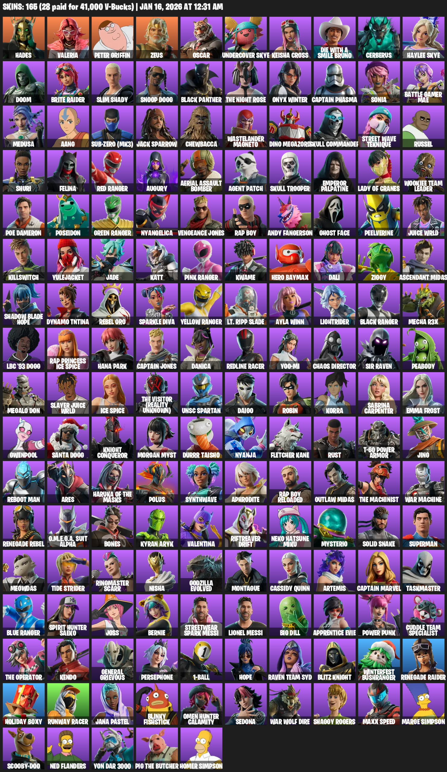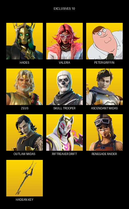Renegade Raider, Hades, Valeria, Peter Griffin, Zeus, Oscar, Undercover Skye, Keisha Cross, Die With A Smile Bruno, Cerberus, Doom, Slim Shady, Snoop Dogg, Black Panther, The Night Rose, Onyx Winter, Captain Phasma, Sonia
