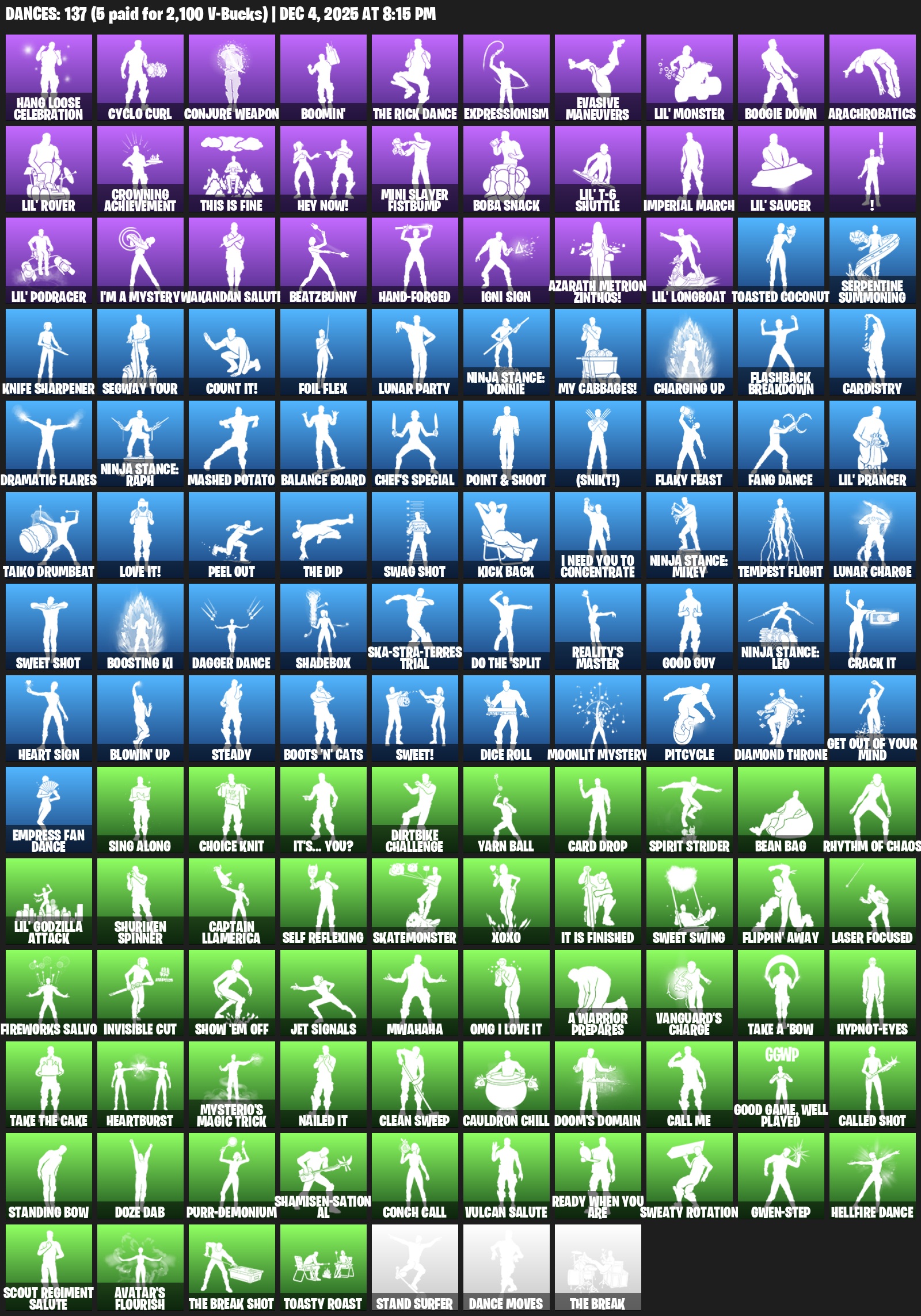 Hang Loose Celebration, Cyclo Curl, Conjure Weapon, Boomin’, Expressionism, Evasive Maneuvers, Lil’ Monster, Boogie Down, Arachrobatics, Crowning Achievement, This is Fine, Hey Now!, Mini Slayer Fistbump, Boba Snack, Imperial March, !