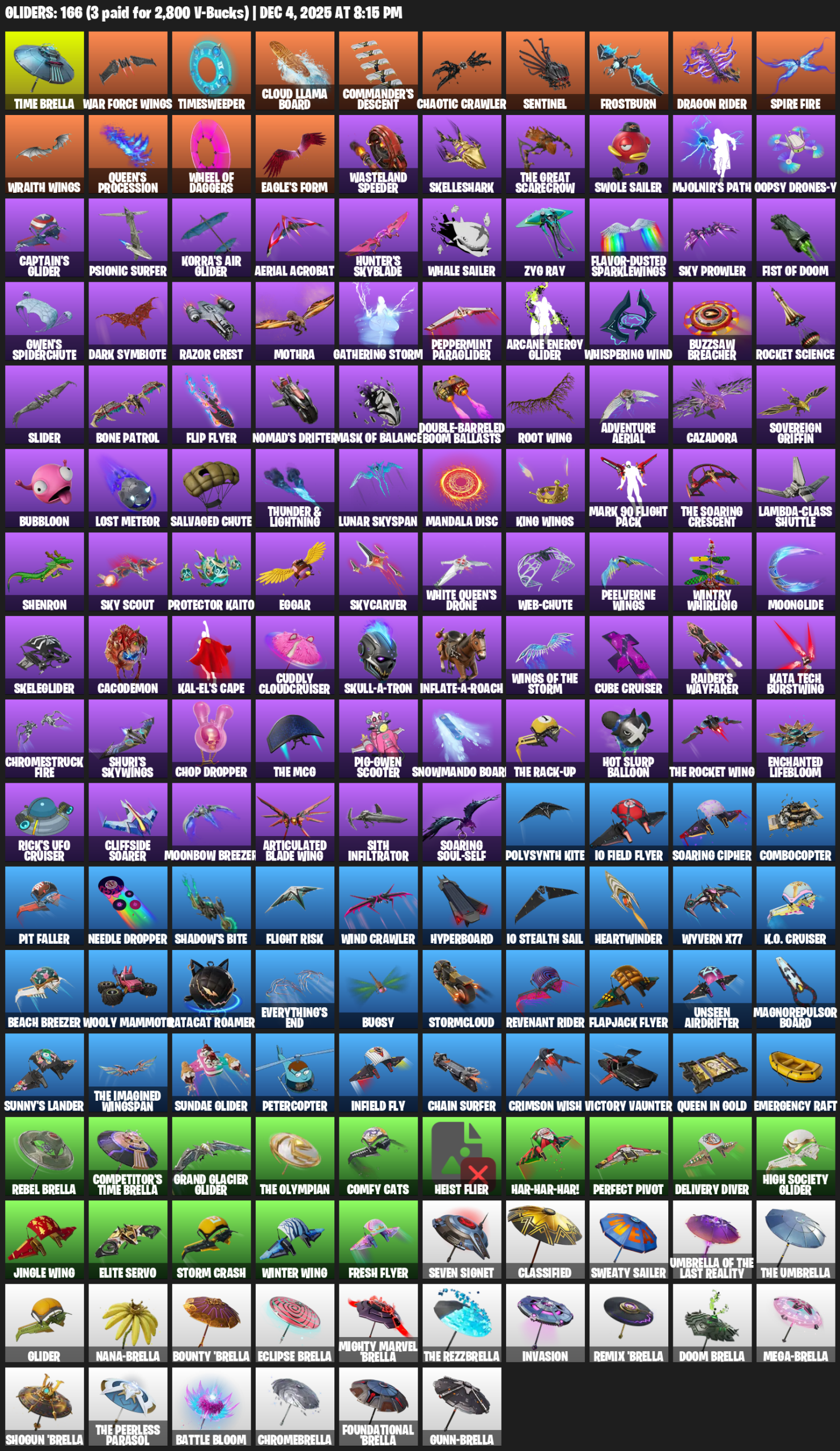 Time Brella, War Force Wings, Timesweeper, Cloud Llama Board, Commander’s Descent, Chaotic Crawler, Sentinel, Frostburn, Dragon Rider, Spire Fire, Queen’s Procession, Eagle’s Form, Wasteland Speeder, Skelleshark, Swole Sailer, Mjolnir’s Path, Oopsy Drones-y