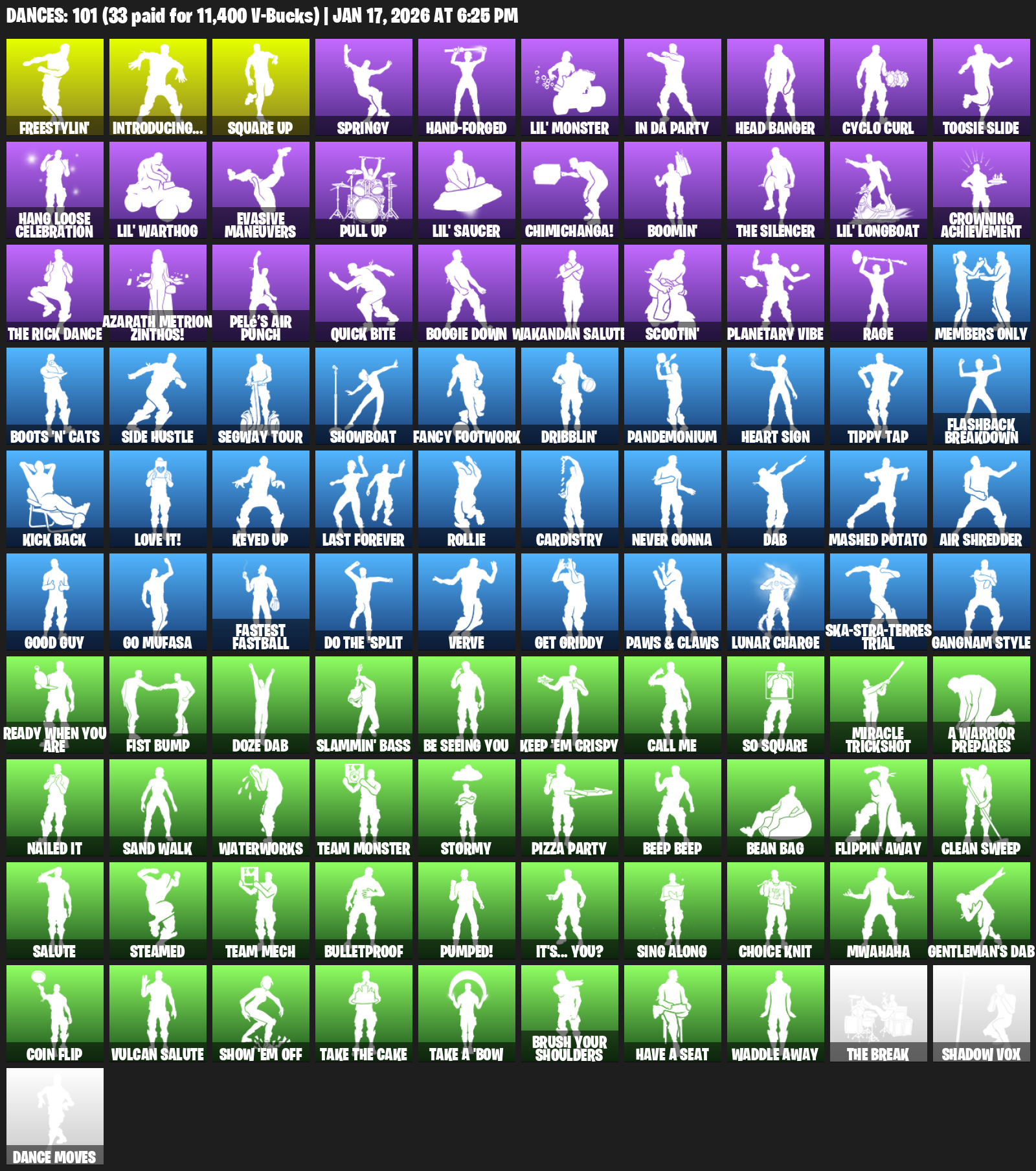 Introducing…, Freestylin’, Square Up, Springy, Hand-Forged, Lil’ Monster, In Da Party, Head Banger, Cyclo Curl, Toosie Slide, Hang Loose Celebration, Evasive Maneuvers, Chimichanga!, Boomin’, Crowning Achievement