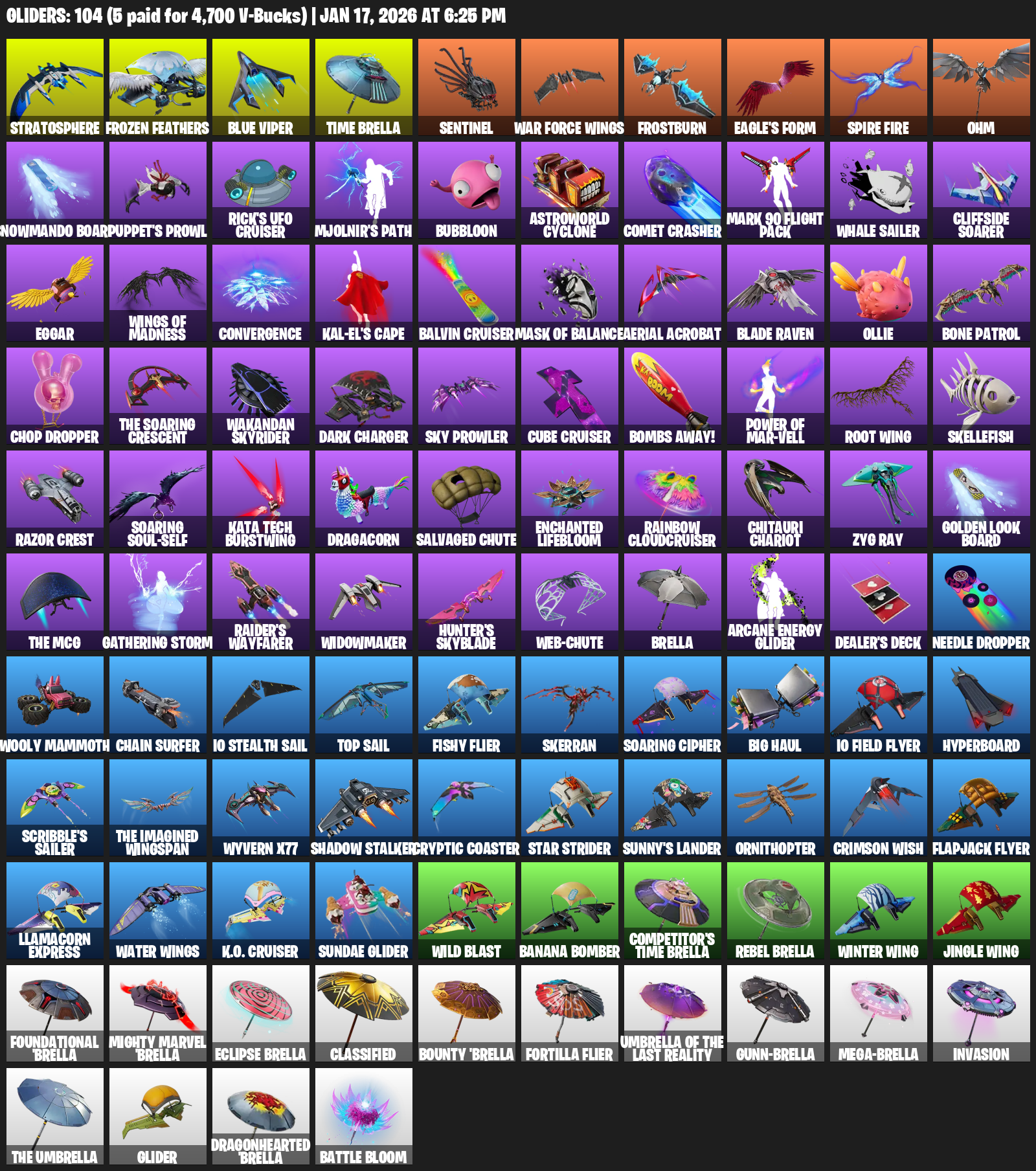 Stratosphere, Blue Viper, Time Brella, Sentinel, War Force Wings, Frostburn, Eagle’s Form, Spire Fire, Ohm, Snowmando Board, Puppet’s Prowl, Rick’s UFO Cruiser, Mjolnir’s Path, Bubbloon, Astroworld Cyclone, Comet Crasher, Mark 90 Flight Pack, Whale Sailer, Cliffside Soarer