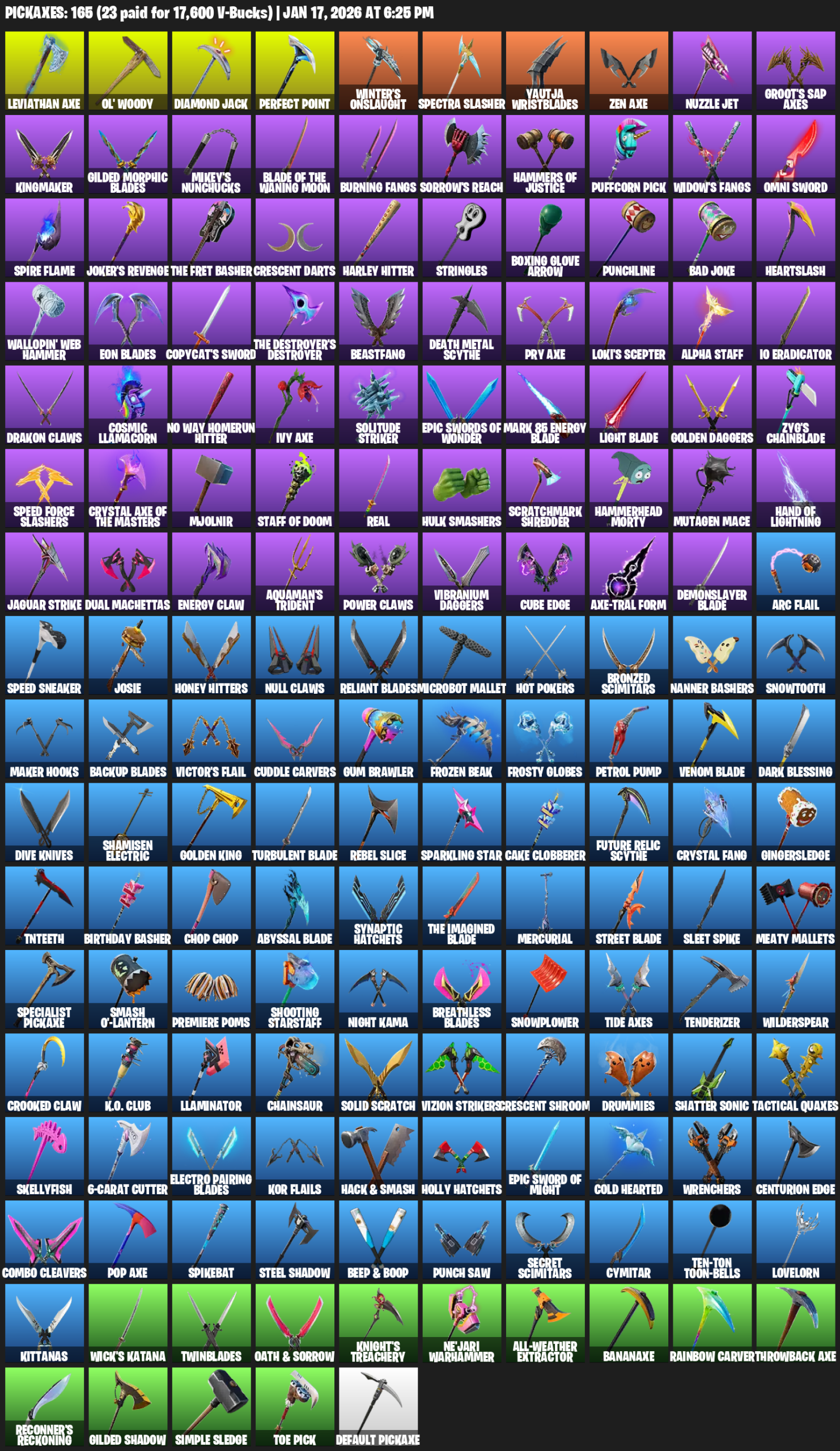 Leviathan Axe, Ol’ Woody, Winter’s Onslaught, Spectra Slasher, Yautja Wristblades, Nuzzle Jet, Groot’s Sap Axes, Kingmaker, Gilded Morphic Blades, Mikey’s Nunchucks, Blade of the Waning Moon, Burning Fangs, Sorrow’s Reach, Puffcorn Pick, Omni Sword