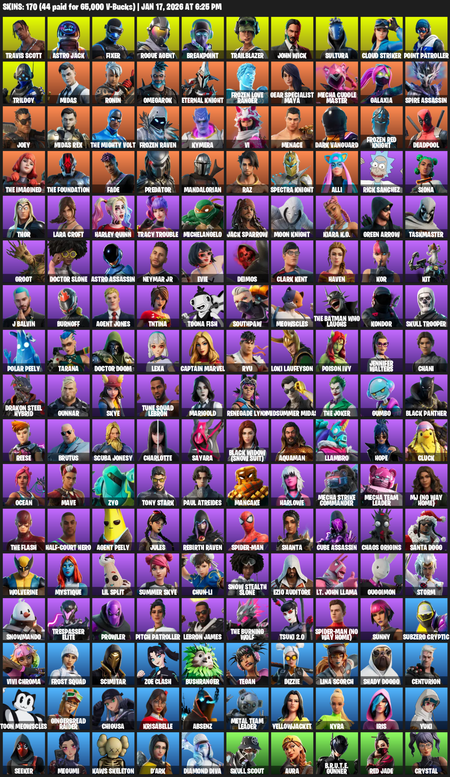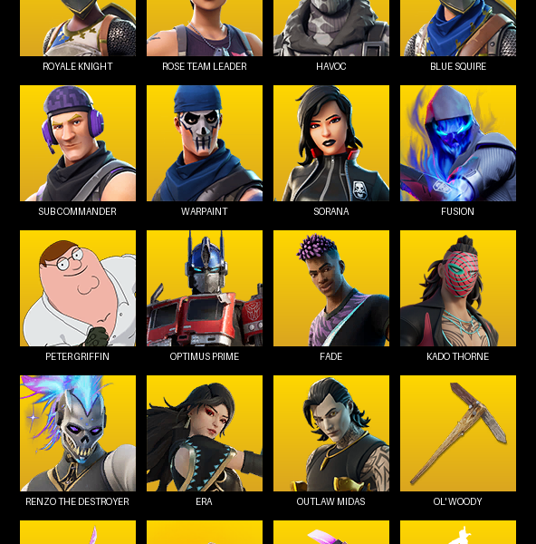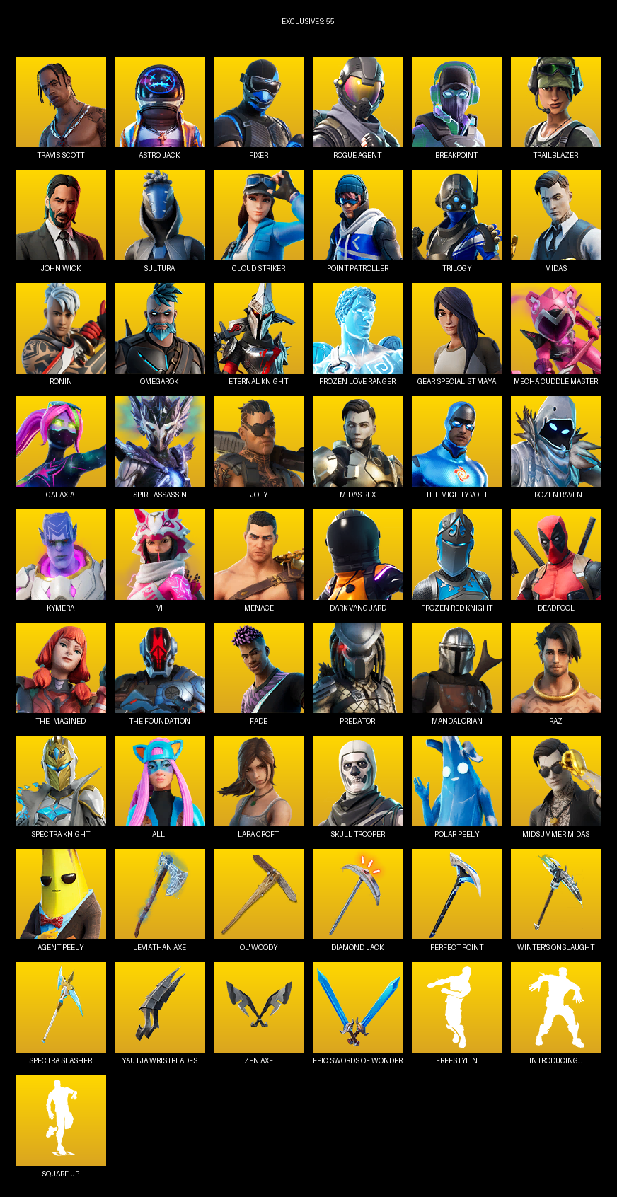 Travis Scott, Point Patroller, Gear Specialist Maya, Lara Croft, Astro Jack, Fixer, Rogue Agent, Breakpoint, Trailblazer, John Wick, Sultura, Cloud Striker, Trilogy, Midas, Ronin, Omegarok, Eternal Knight, Frozen Love Ranger, Mecha Cuddle Master, Galaxia