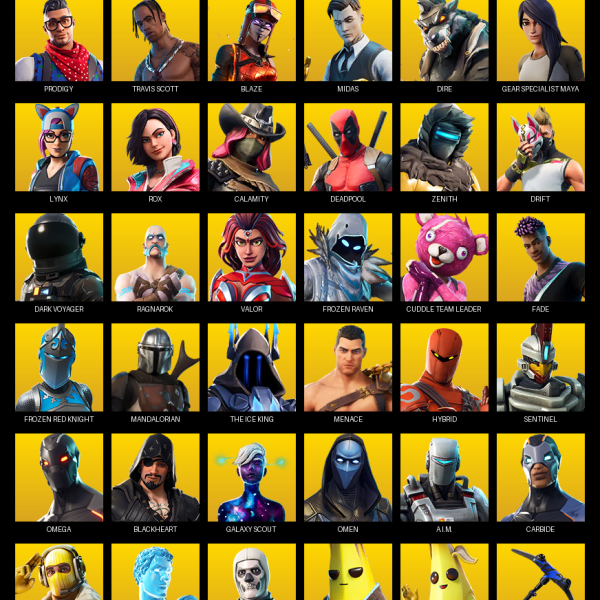 Travis Scott, Point Patroller, Gear Specialist Maya, Lara Croft, Kratos, Breakpoint, Neo Versa, Sultura, Cloud Striker, Fixer, Trilogy, Molten Battle Hound, Spectra Knight, Fade, Midas Rex, Mecha Cuddle Master, Kymera, Raptor, Raz, Menace