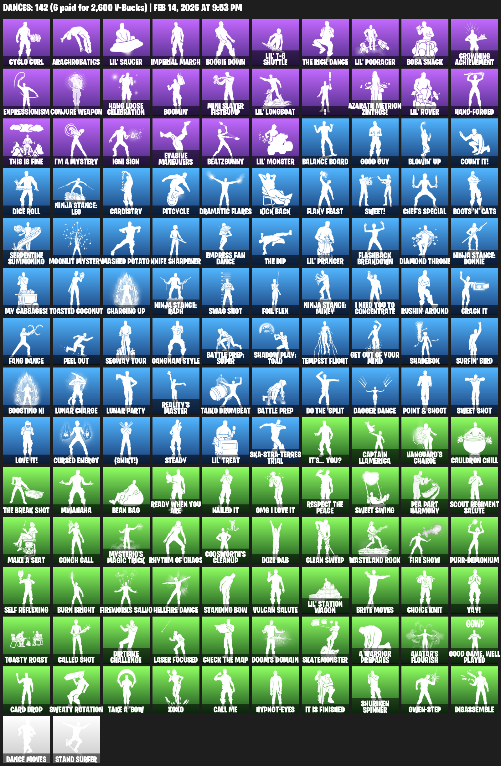 Cyclo Curl, Arachrobatics, Lil’ Saucer, Imperial March, Boogie Down, Boba Snack, Crowning Achievement, Expressionism, Conjure Weapon, Hang Loose Celebration, Boomin’, Mini Slayer Fistbump, !, Azarath Metrion Zinthos!, Hand-Forged