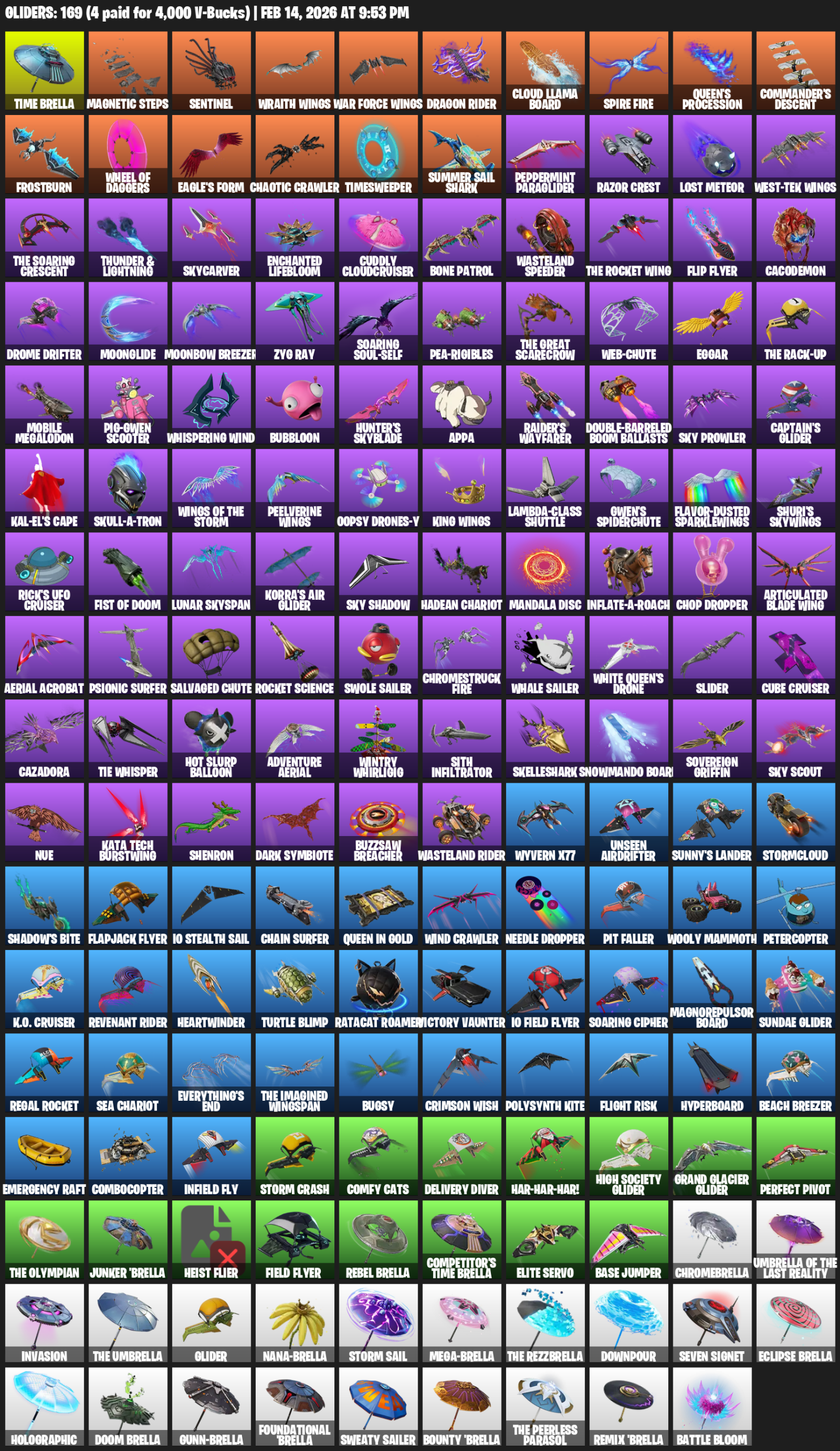 Time Brella, Magnetic Steps, Sentinel, Wraith Wings, Cloud Llama Board, Queen’s Procession, Commander’s Descent, Frostburn, Eagle’s Form, Chaotic Crawler, Timesweeper, Summer Sail Shark, Peppermint Paraglider, Razor Crest, Lost Meteor