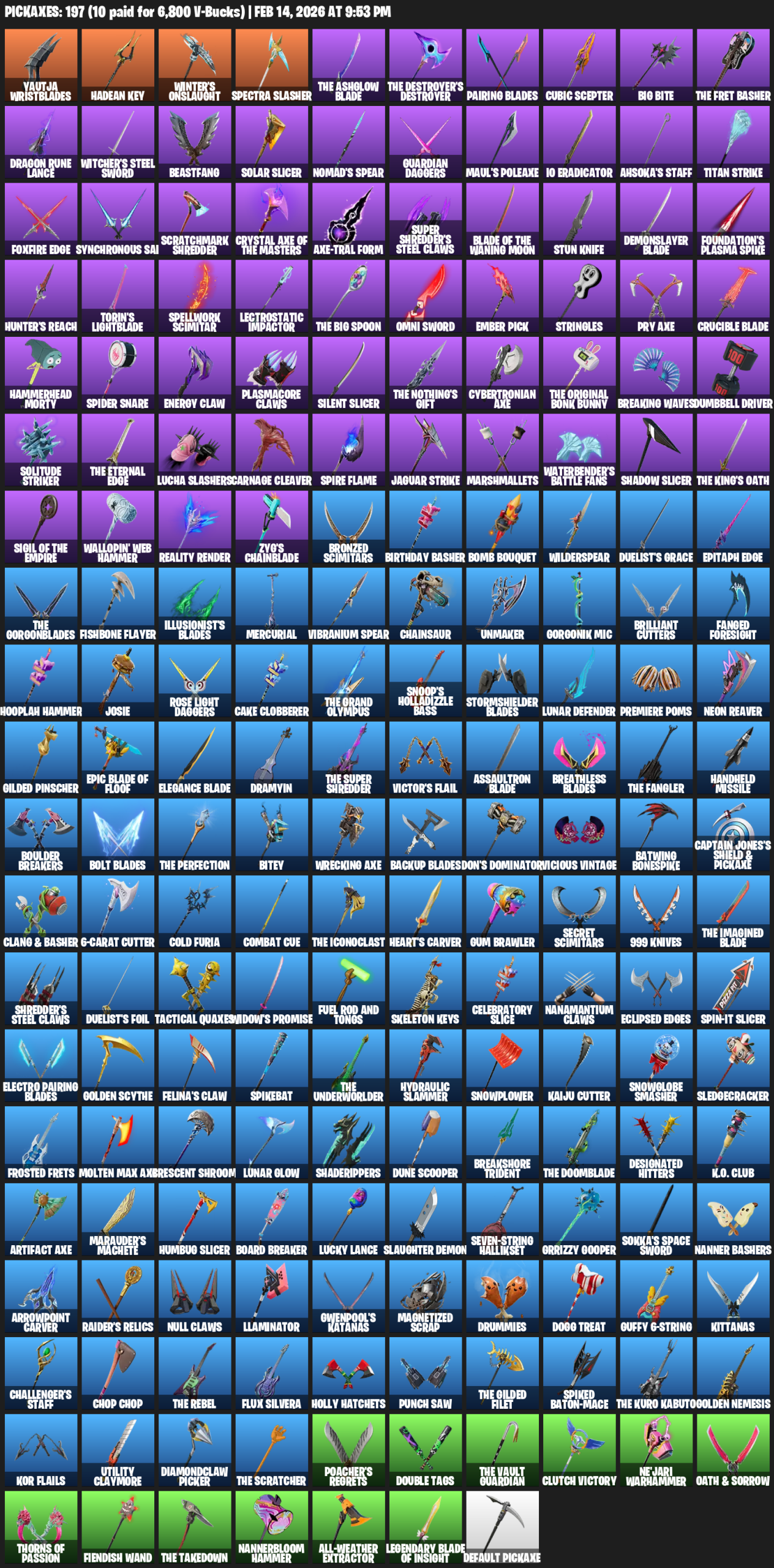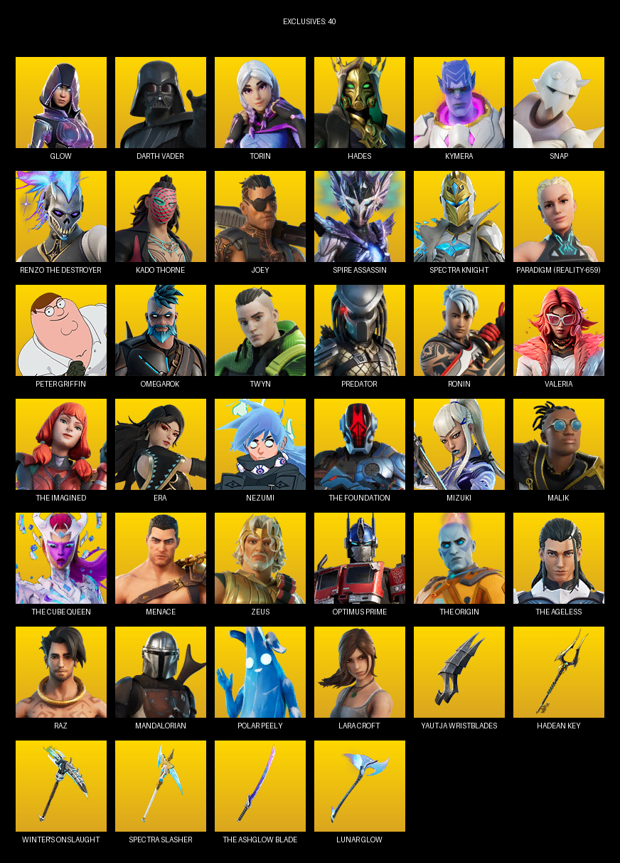 Yautja Wristblades, Hadean Key, Winter’s Onslaught, Pairing Blades, Cubic Scepter, Big Bite, Dragon Rune Lance, Witcher’s Steel Sword, Beastfang, Solar Slicer, Nomad’s Spear, Guardian Daggers, Maul’s Poleaxe, IO Eradicator, Ahsoka’s Staff, Titan Strike