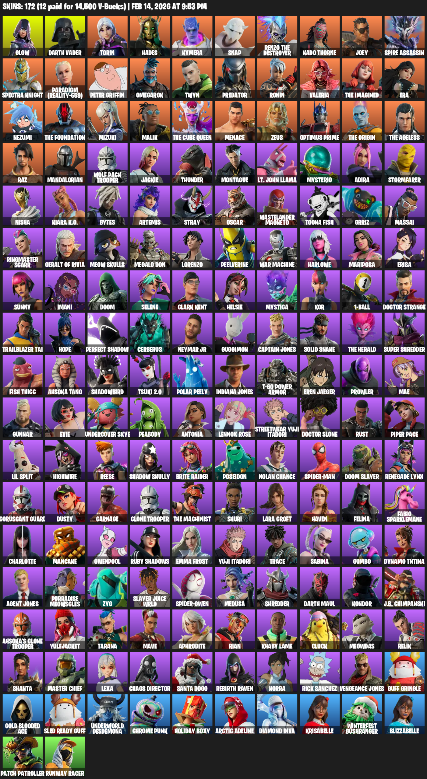 Lara Croft, Glow, Darth Vader, Torin, Hades, Kymera, Snap, Renzo the Destroyer, Kado Thorne, Joey, Spire Assassin, Spectra Knight, Paradigm (Reality-659), Peter Griffin, Omegarok, Twyn, Predator, Ronin, Valeria