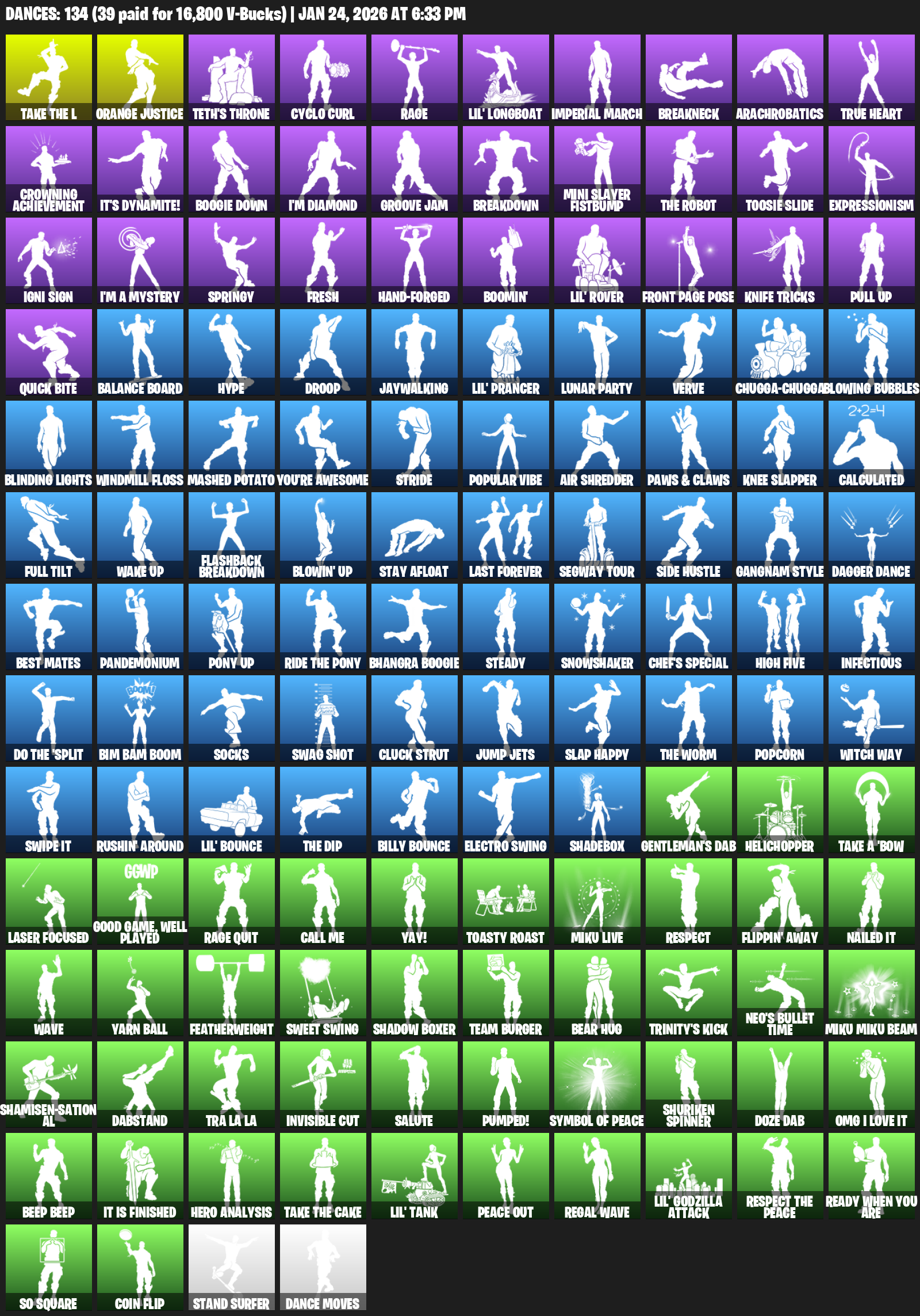 Orange Justice, Teth’s Throne, Cyclo Curl, Rage, Lil’ Longboat, Imperial March, Breakneck, Arachrobatics, True Heart, Crowning Achievement, It’s Dynamite!, Boogie Down, I’m Diamond, Groove Jam, Breakdown, Mini Slayer Fistbump, Toosie Slide, Expressionism