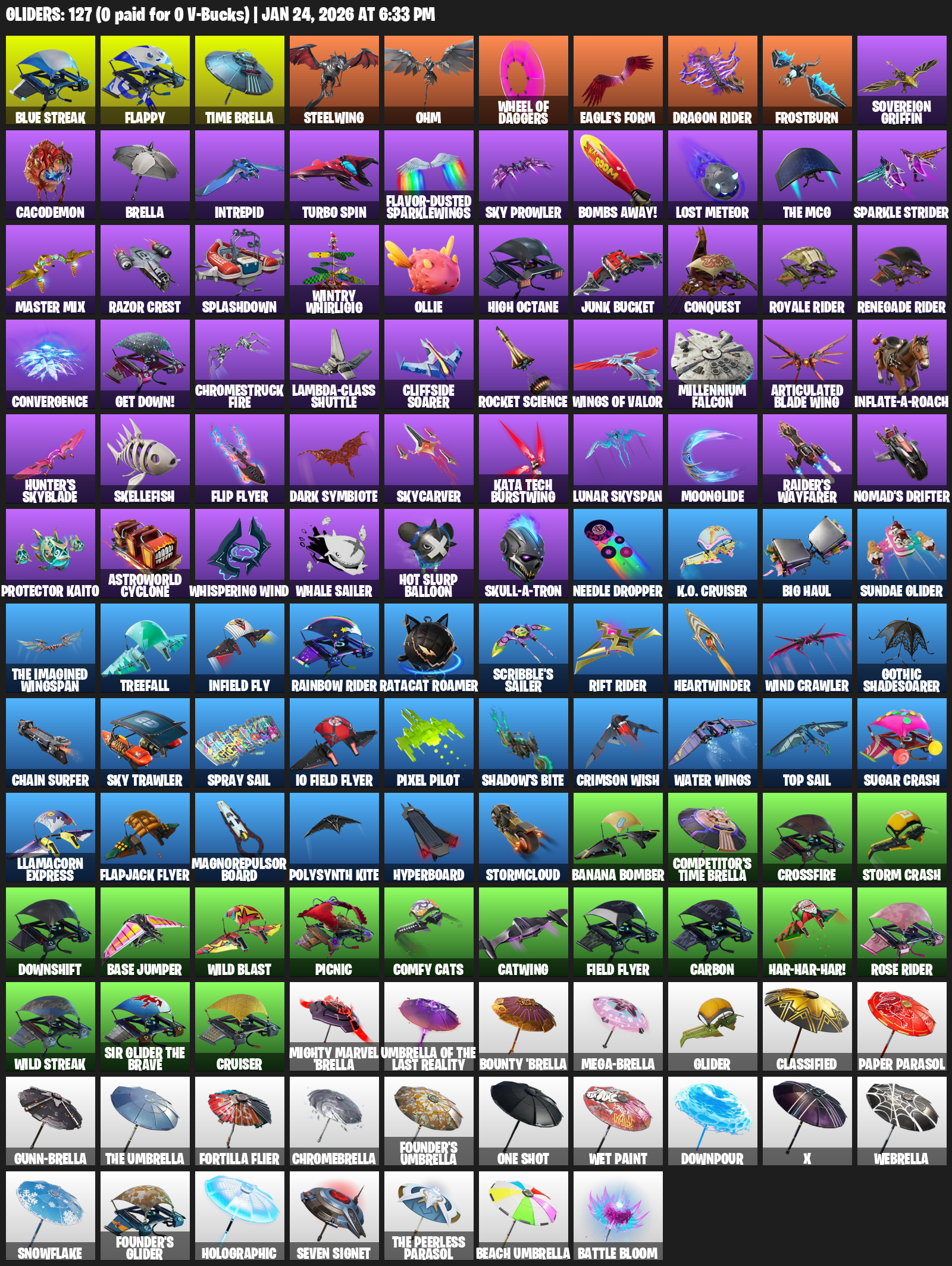 Flappy, Time Brella, Steelwing, Ohm, Wheel of Daggers, Eagle’s Form, Dragon Rider, Frostburn, Sovereign Griffin, Cacodemon, Intrepid, Turbo Spin, Flavor-Dusted Sparklewings, Sky Prowler, Bombs Away!, Lost Meteor, Sparkle Strider