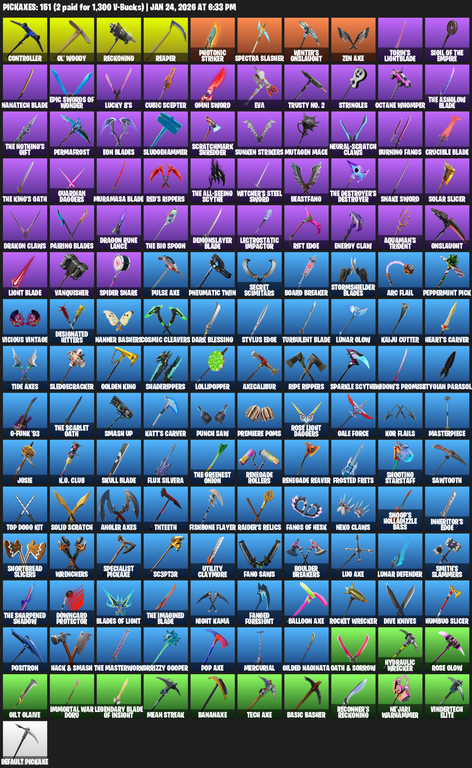 Controller, Ol’ Woody, Reckoning, Photonic Striker, Spectra Slasher, Winter’s Onslaught, Zen Axe, Torin’s Lightblade, NanaTech Blade, Lucky 8’s, Cubic Scepter, Omni Sword, EVA, Trusty No. 2, Stringles, Octane Whomper