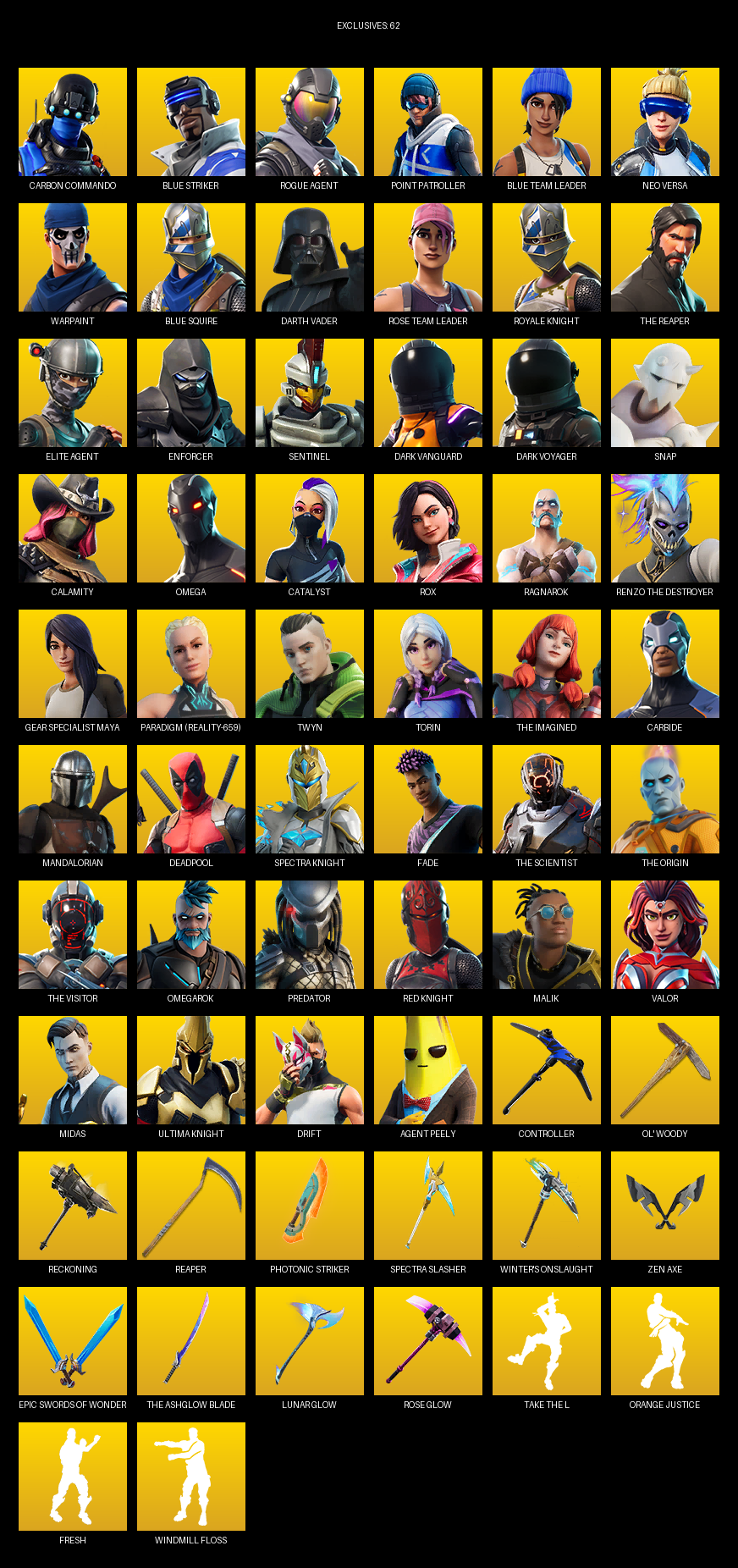 [PC/XBOX] | 172 skins | Take The L | OG STW | Royale Knight | The Reaper | Elite Agent | Blue Squire | Omega | Carbon Commando | #RUM7842