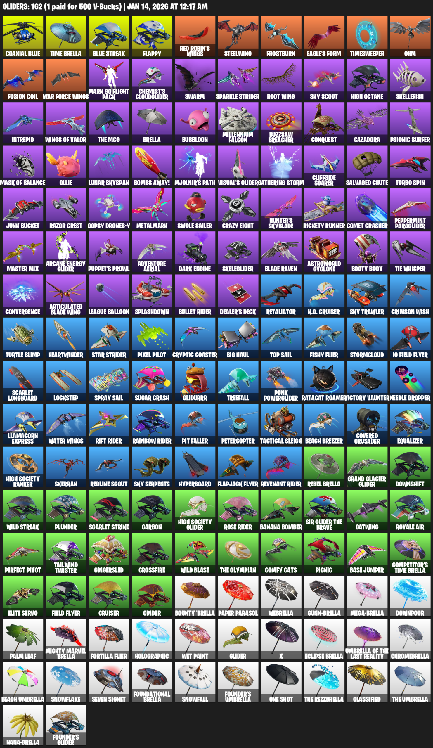 Time Brella, Flappy, Red Robin’s Wings, Steelwing, Frostburn, Eagle’s Form, Timesweeper, Ohm, Mark 90 Flight Pack, Chemist’s Cloudglider, Swarm, Sparkle Strider, Root Wing, Sky Scout, High Octane, Skellefish