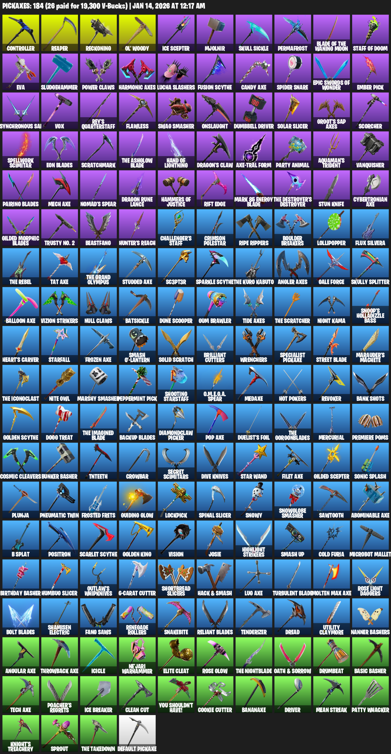 Controller, Reckoning, Ol’ Woody, Ice Scepter, Mjolnir, Skull Sickle, Permafrost, Staff of Doom, EVA, Sludgehammer, Power Claws, Harmonic Axes, Lucha Slashers, Fusion Scythe, Candy Axe, Spider Snare, Ember Pick