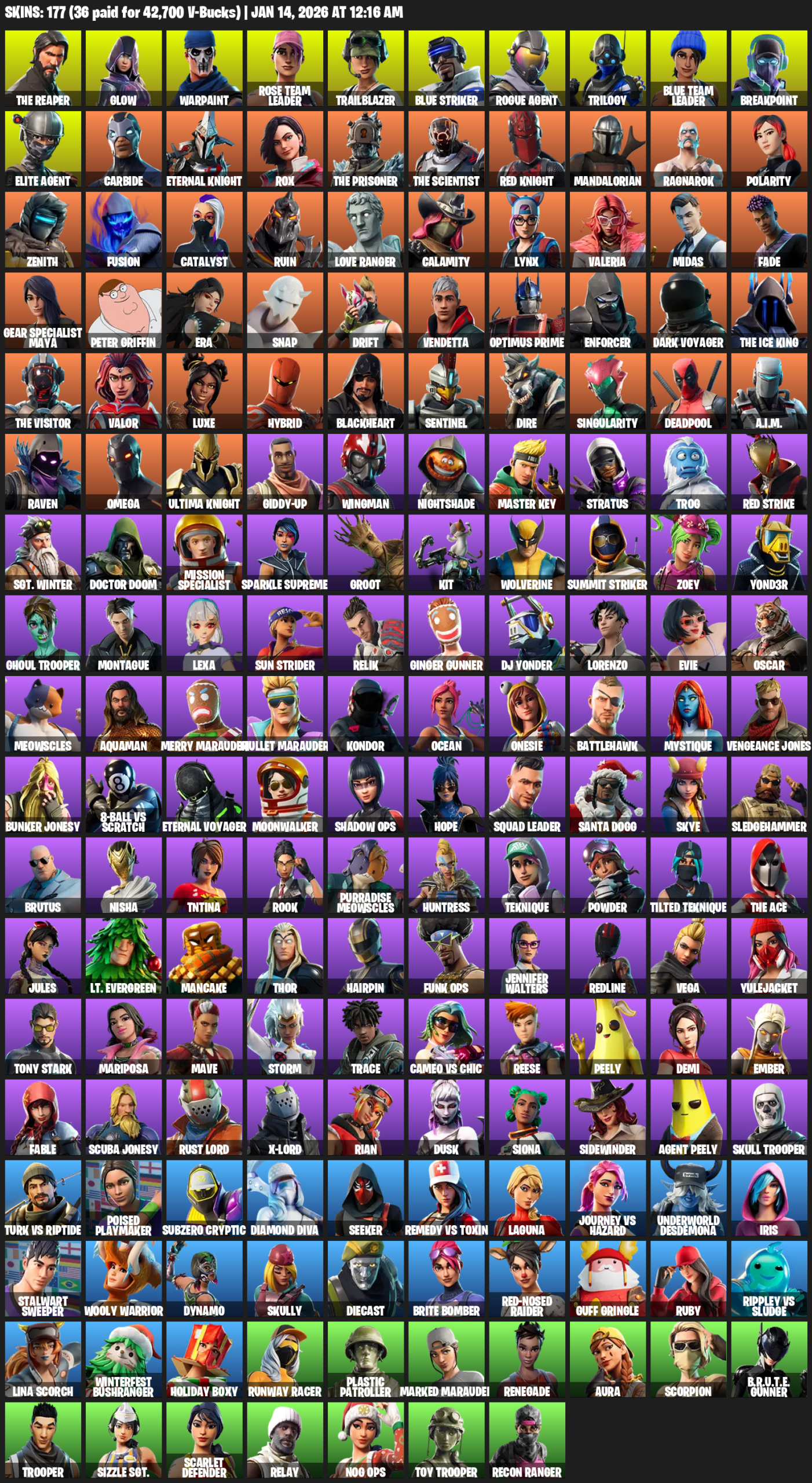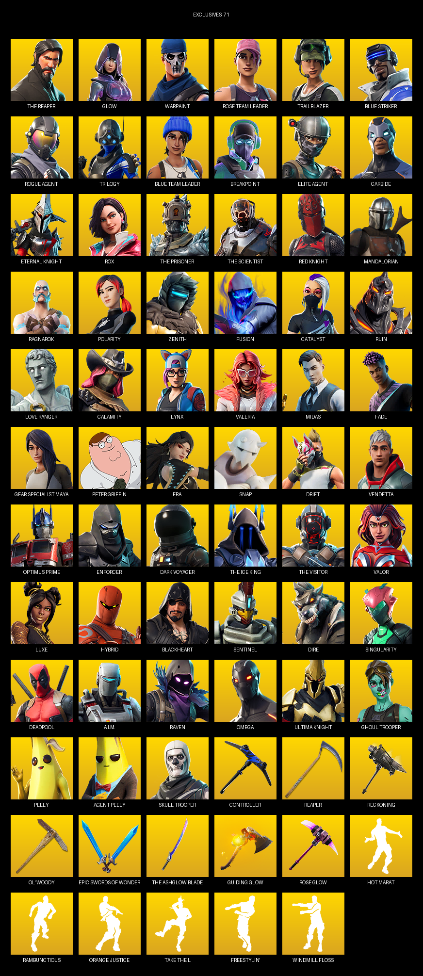 The Reaper, Elite Agent, Gear Specialist Maya, Omega, Glow, Warpaint, Rose Team Leader, Trailblazer, Blue Striker, Trilogy, Breakpoint, Carbide, Eternal Knight, Rox, Mandalorian
