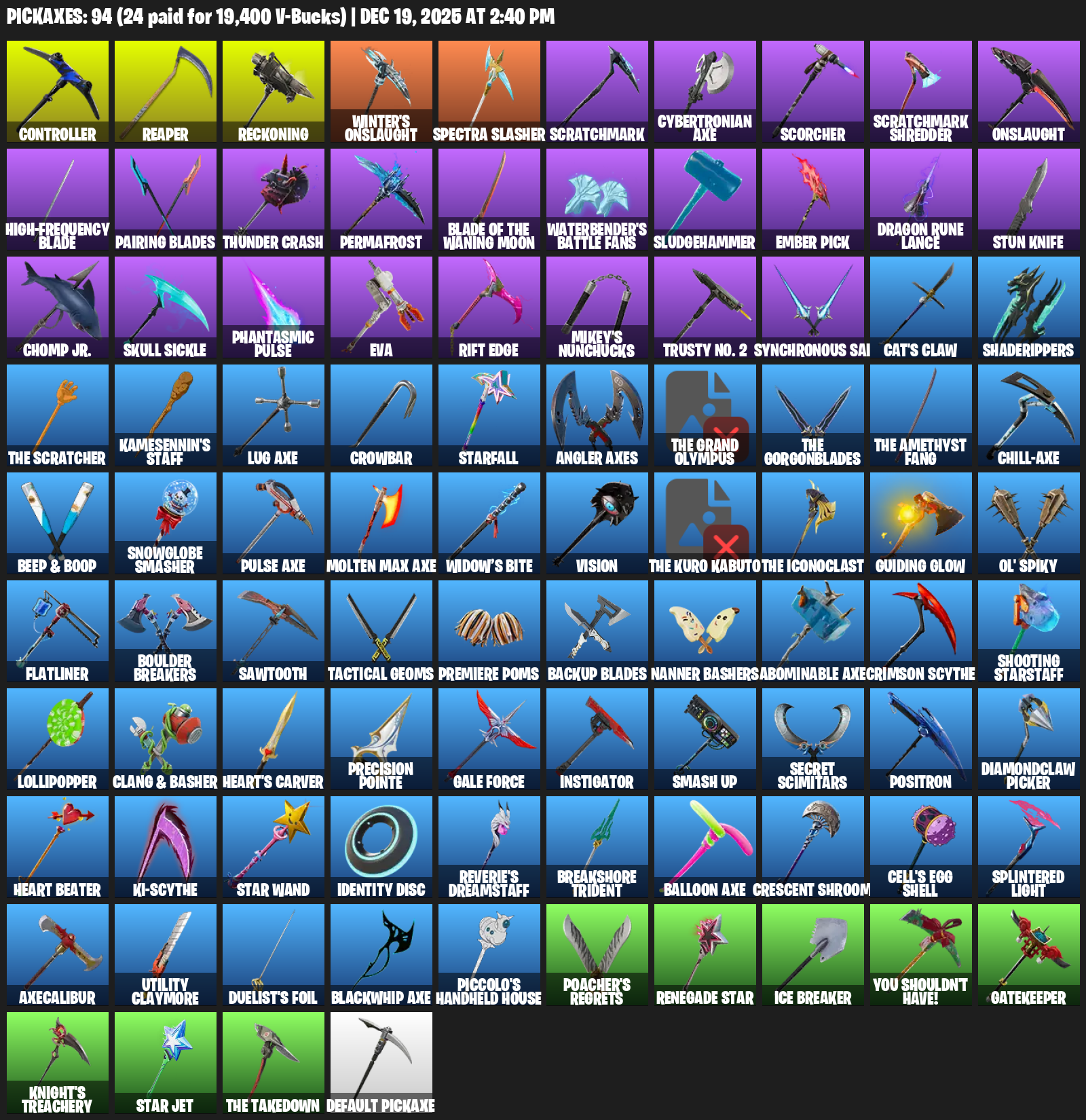 Controller, Reckoning, Winter’s Onslaught, Spectra Slasher, Scratchmark, Cybertronian Axe, Scorcher, High-frequency Blade, Pairing Blades, Thunder Crash, Permafrost, Waterbender’s Battle Fans, Sludgehammer, Ember Pick, Dragon Rune Lance, Stun Knife