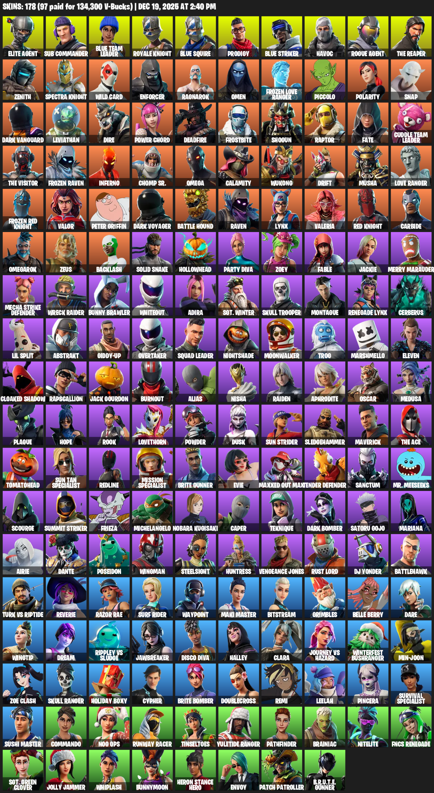 Elite Agent, Royale Knight, Blue Squire, The Reaper, Omega, Sub Commander, Prodigy, Havoc, Zenith, Wild Card, Enforcer, Ragnarok, Omen, Frozen Love Ranger, Piccolo, Polarity