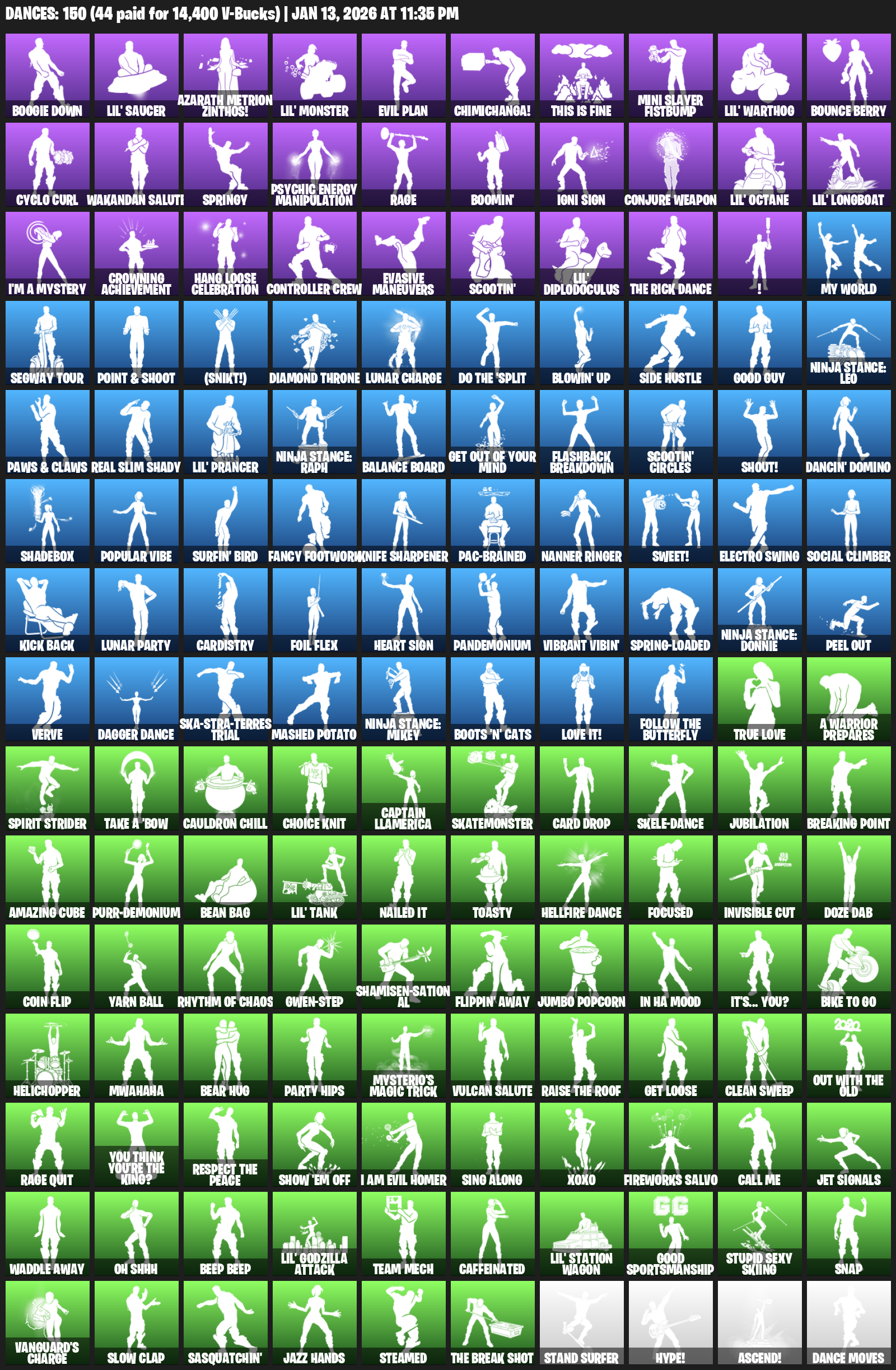 Boogie Down, Lil’ Saucer, Azarath Metrion Zinthos!, Evil Plan, Chimichanga!, This is Fine, Mini Slayer Fistbump, Bounce Berry, Cyclo Curl, Wakandan Salute, Springy, Rage, Boomin’, Igni Sign, Conjure Weapon