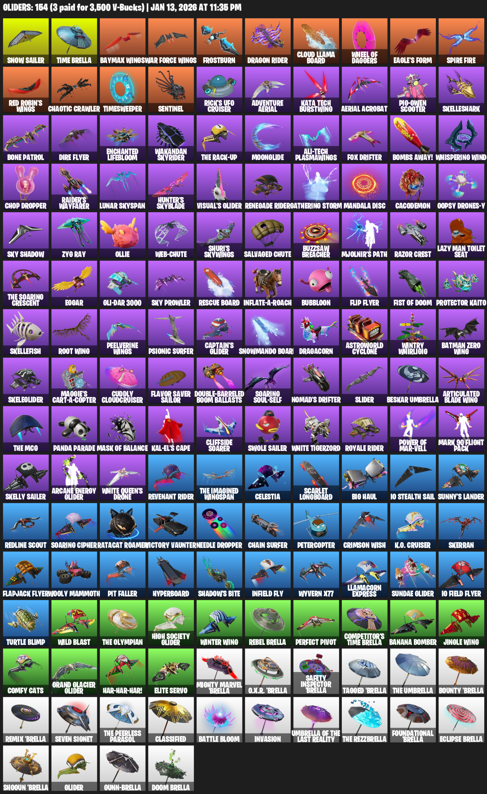 Snow Sailer, Time Brella, Baymax Wings, Frostburn, Dragon Rider, Cloud Llama Board, Eagle’s Form, Chaotic Crawler, Timesweeper, Sentinel, Rick’s UFO Cruiser, Adventure Aerial, Kata Tech Burstwing, Pig-Gwen Scooter, Skelleshark