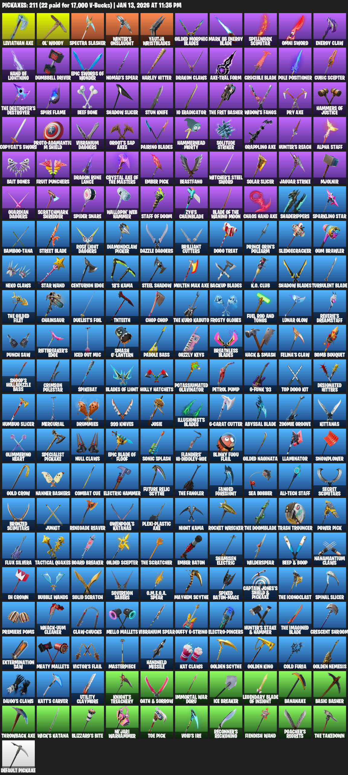 Leviathan Axe, Ol’ Woody, Winter’s Onslaught, Yautja Wristblades, Gilded Morphic Blades, Mark 85 Energy Blade, Spellwork Scimitar, Omni Sword, Hand of Lightning, Dumbbell Driver, Nomad’s Spear, Harley Hitter, Drakon Claws, Pole Positioner, Cubic Scepter