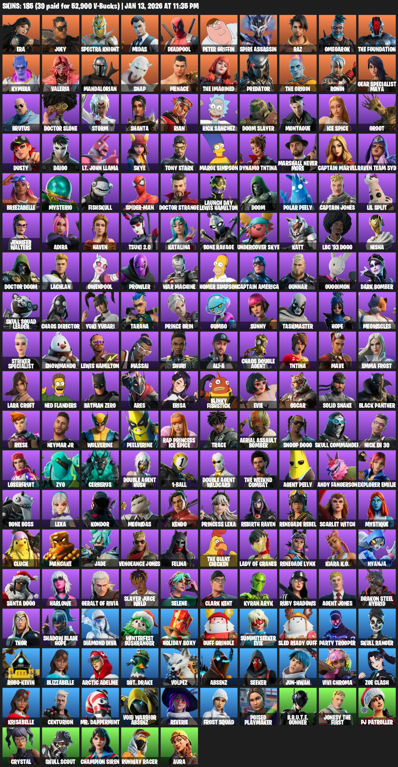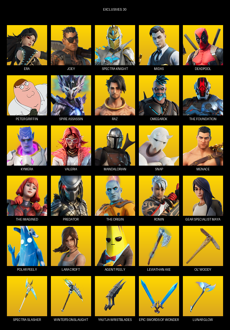 Gear Specialist Maya, Lara Croft, Era, Joey, Spectra Knight, Midas, Deadpool, Peter Griffin, Spire Assassin, Raz, Omegarok, The Foundation, Kymera, Valeria, Mandalorian, Snap, Menace, Predator