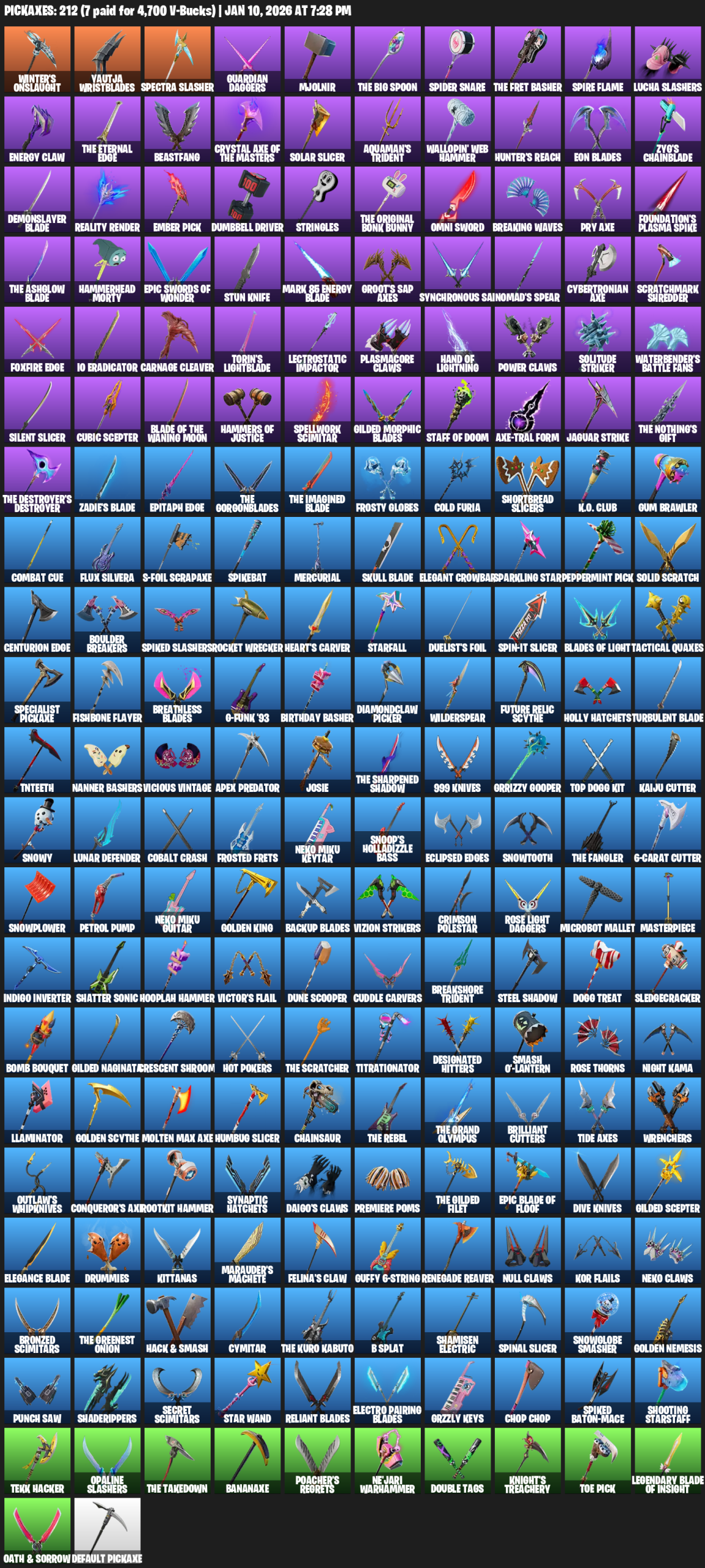 Winter’s Onslaught, Yautja Wristblades, Guardian Daggers, Mjolnir, Spider Snare, Spire Flame, Lucha Slashers, Energy Claw, Beastfang, Solar Slicer, Aquaman’s Trident, Wallopin’ Web Hammer, Hunter’s Reach, Eon Blades, Zyg’s Chainblade