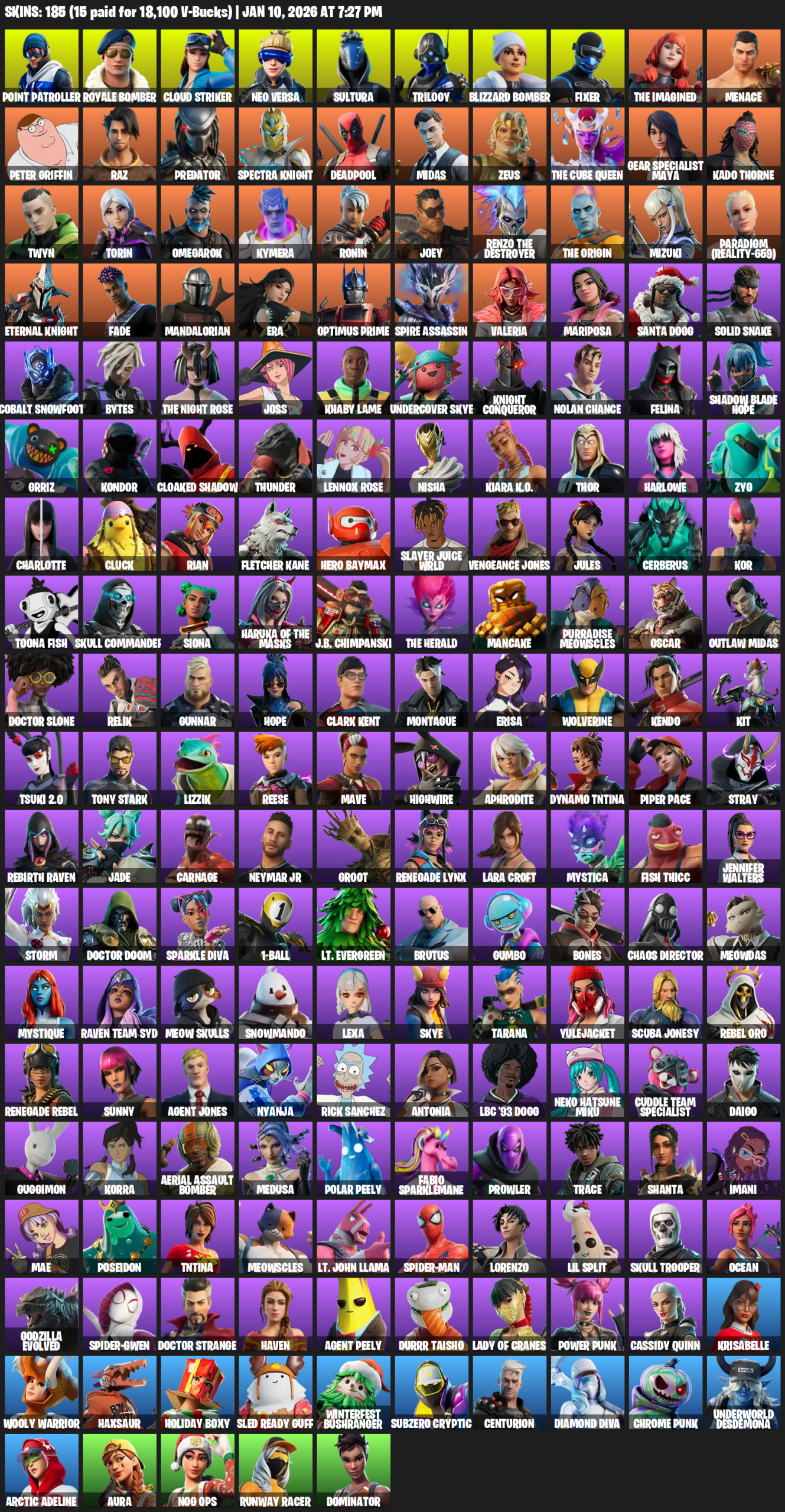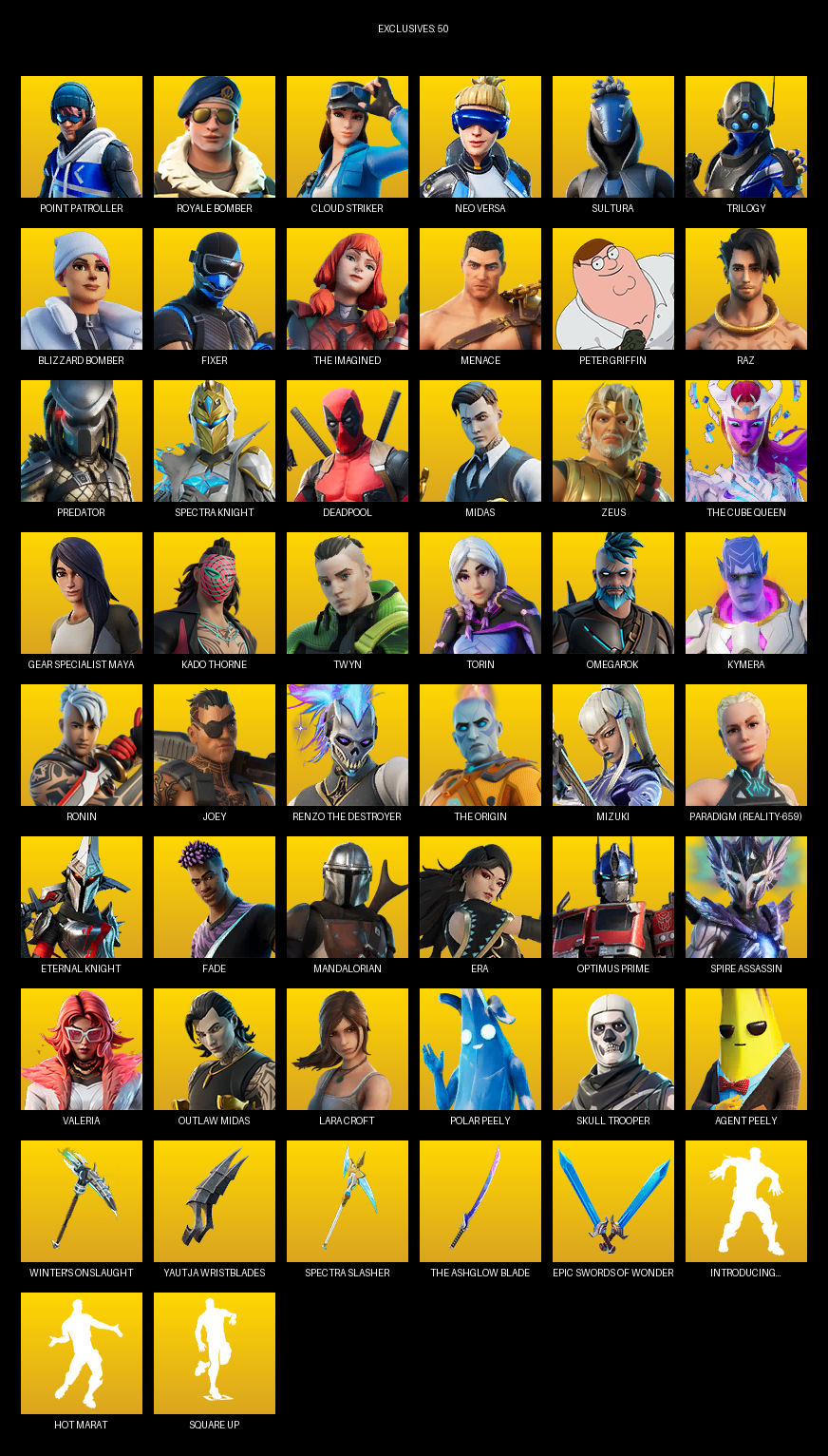 Point Patroller, Gear Specialist Maya, Lara Croft, Royale Bomber, Cloud Striker, Neo Versa, Sultura, Trilogy, Fixer, The Imagined, Menace, Peter Griffin, Raz, Predator, Spectra Knight, Deadpool, Midas, Zeus