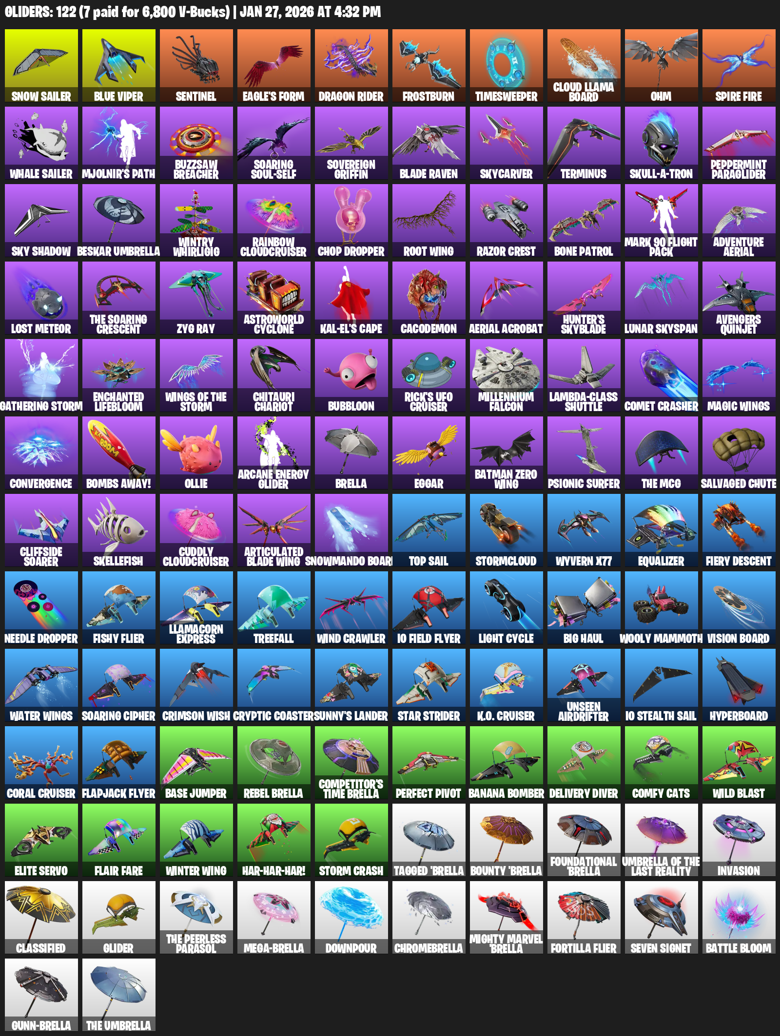 Snow Sailer, Blue Viper, Sentinel, Eagle’s Form, Frostburn, Timesweeper, Ohm, Mjolnir’s Path, Buzzsaw Breacher, Soaring Soul-Self, Sovereign Griffin, Skycarver, Terminus, Skull-a-tron, Peppermint Paraglider