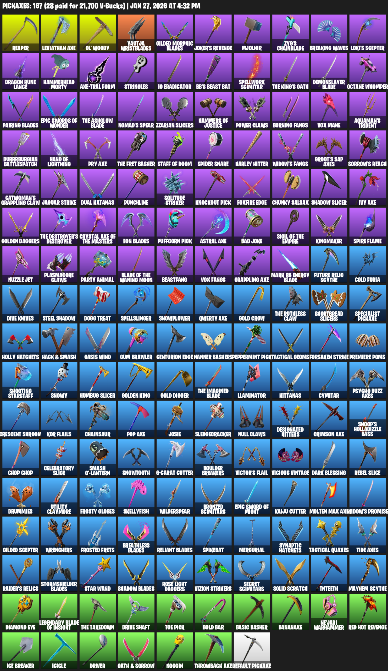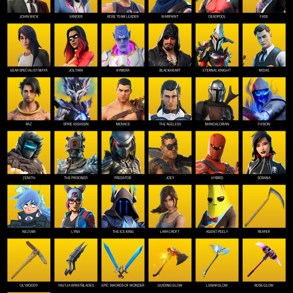 Leviathan Axe, Reaper, Ol’ Woody, Yautja Wristblades, Gilded Morphic Blades, Joker’s Revenge, Mjolnir, Zyg’s Chainblade, Breaking Waves, Loki’s Scepter, Dragon Rune Lance, Hammerhead Morty, Stringles, IO Eradicator, BB’s Beast Bat, Spellwork Scimitar, Demonslayer Blade, Octane Whomper