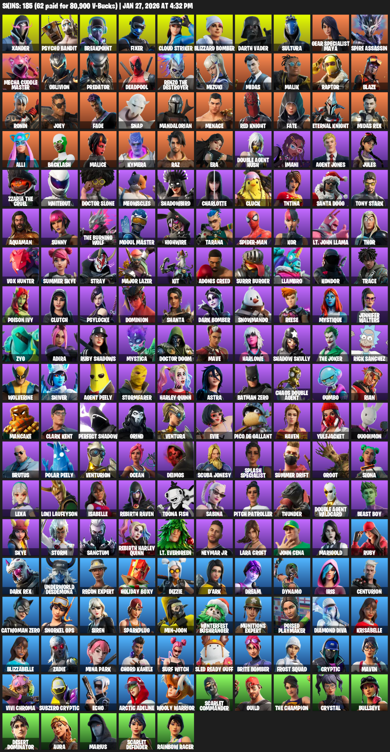 Gear Specialist Maya, Lara Croft, Xander, Psycho Bandit, Breakpoint, Fixer, Cloud Striker, Blizzard Bomber, Darth Vader, Sultura, Spire Assassin, Mecha Cuddle Master, Oblivion, Predator, Deadpool, Renzo the Destroyer, Mizuki, Midas, Malik, Raptor
