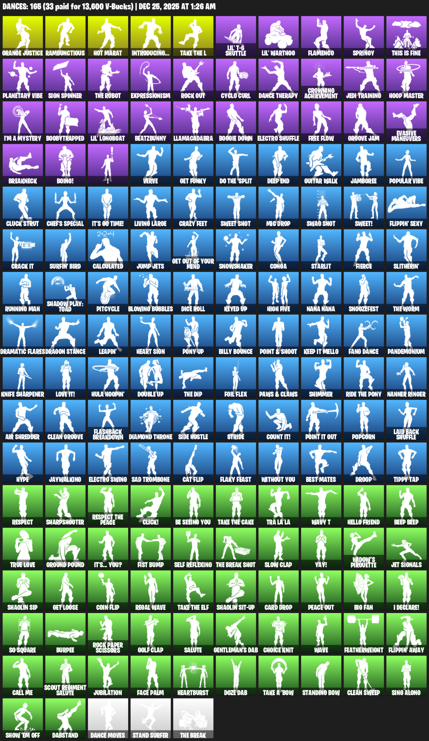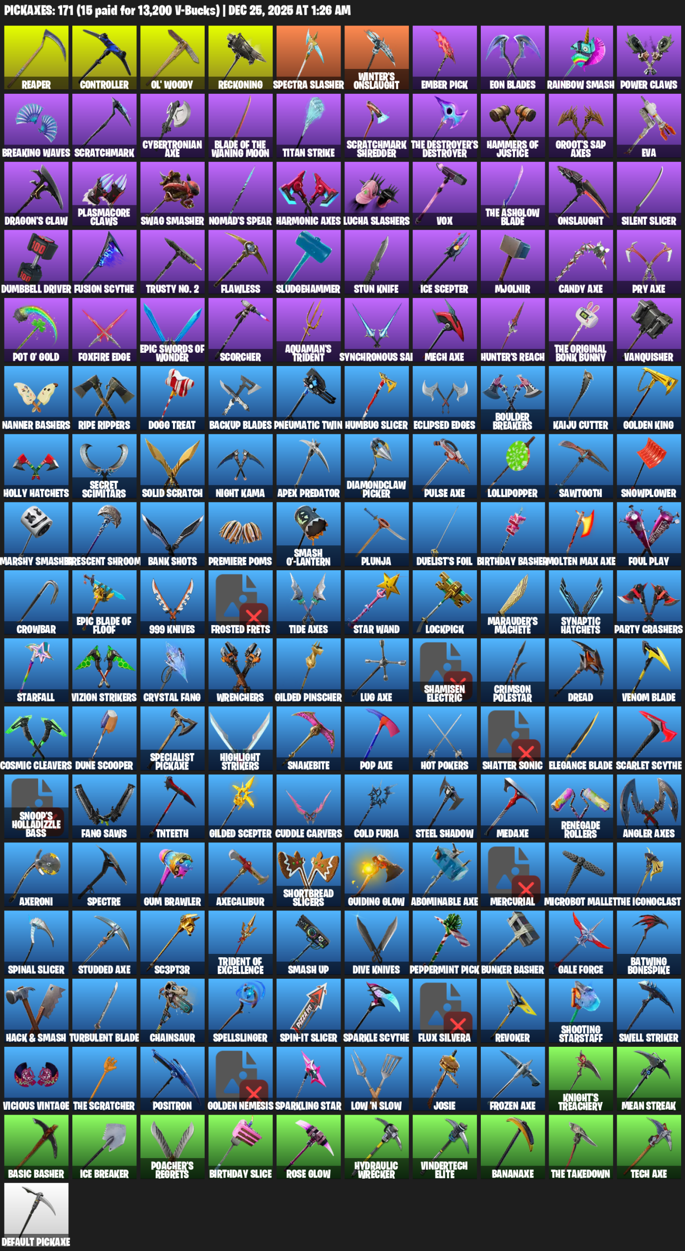 Controller, Ol’ Woody, Reckoning, Spectra Slasher, Winter’s Onslaught, Ember Pick, Eon Blades, Rainbow Smash, Power Claws, Breaking Waves, Scratchmark, Cybertronian Axe, Titan Strike, Hammers of Justice, Groot’s Sap Axes, EVA
