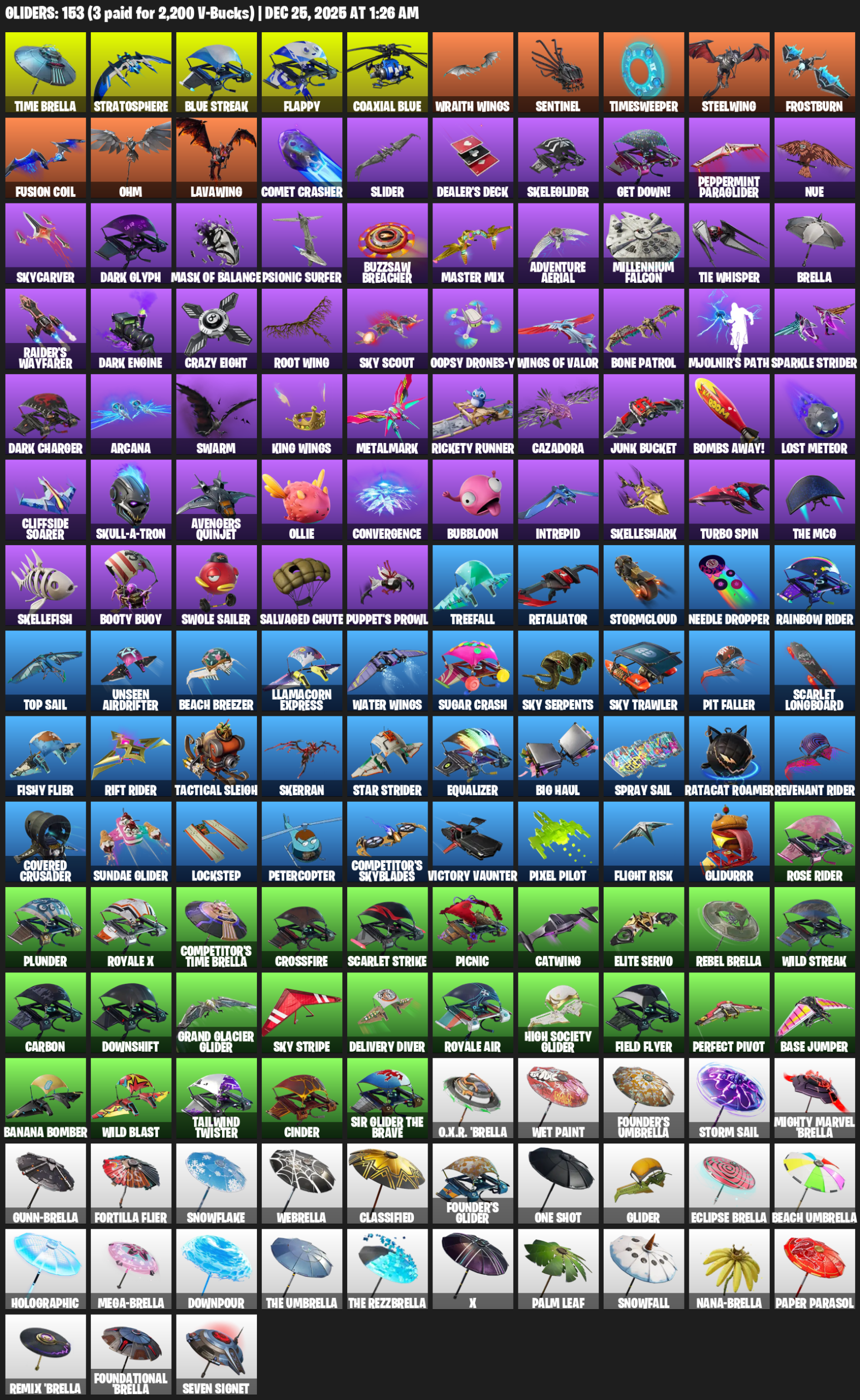 Time Brella, Stratosphere, Flappy, Wraith Wings, Sentinel, Timesweeper, Steelwing, Frostburn, Ohm, Lavawing, Comet Crasher, Slider, Dealer’s Deck, Skeleglider, Get Down!, Peppermint Paraglider, Nue
