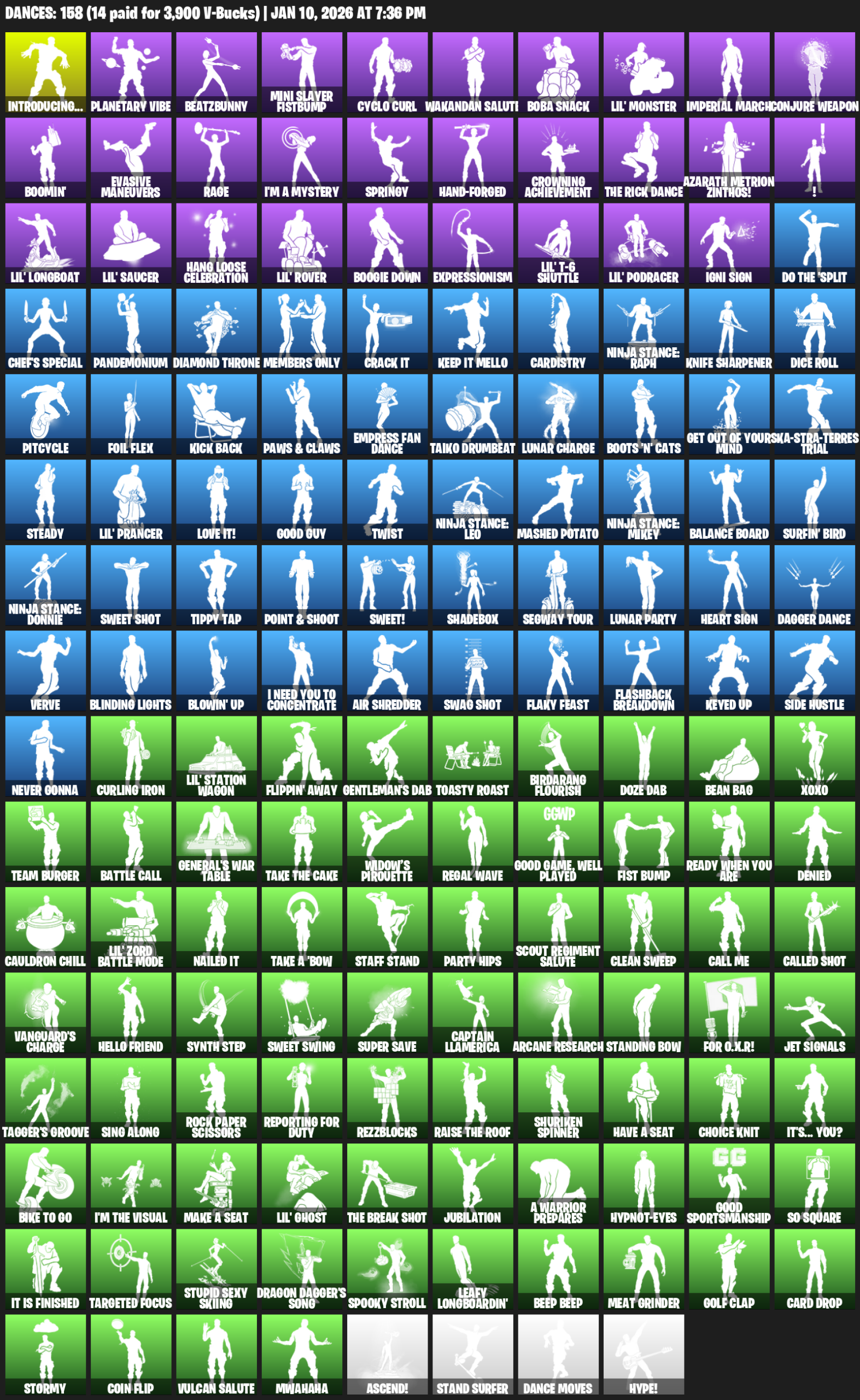 Introducing…, Planetary Vibe, BeatzBunny, Mini Slayer Fistbump, Cyclo Curl, Wakandan Salute, Boba Snack, Lil’ Monster, Imperial March, Conjure Weapon, Boomin’, Evasive Maneuvers, Rage, I’m a Mystery, Springy, Hand-Forged, Crowning Achievement, Azarath Metrion Zinthos!, !