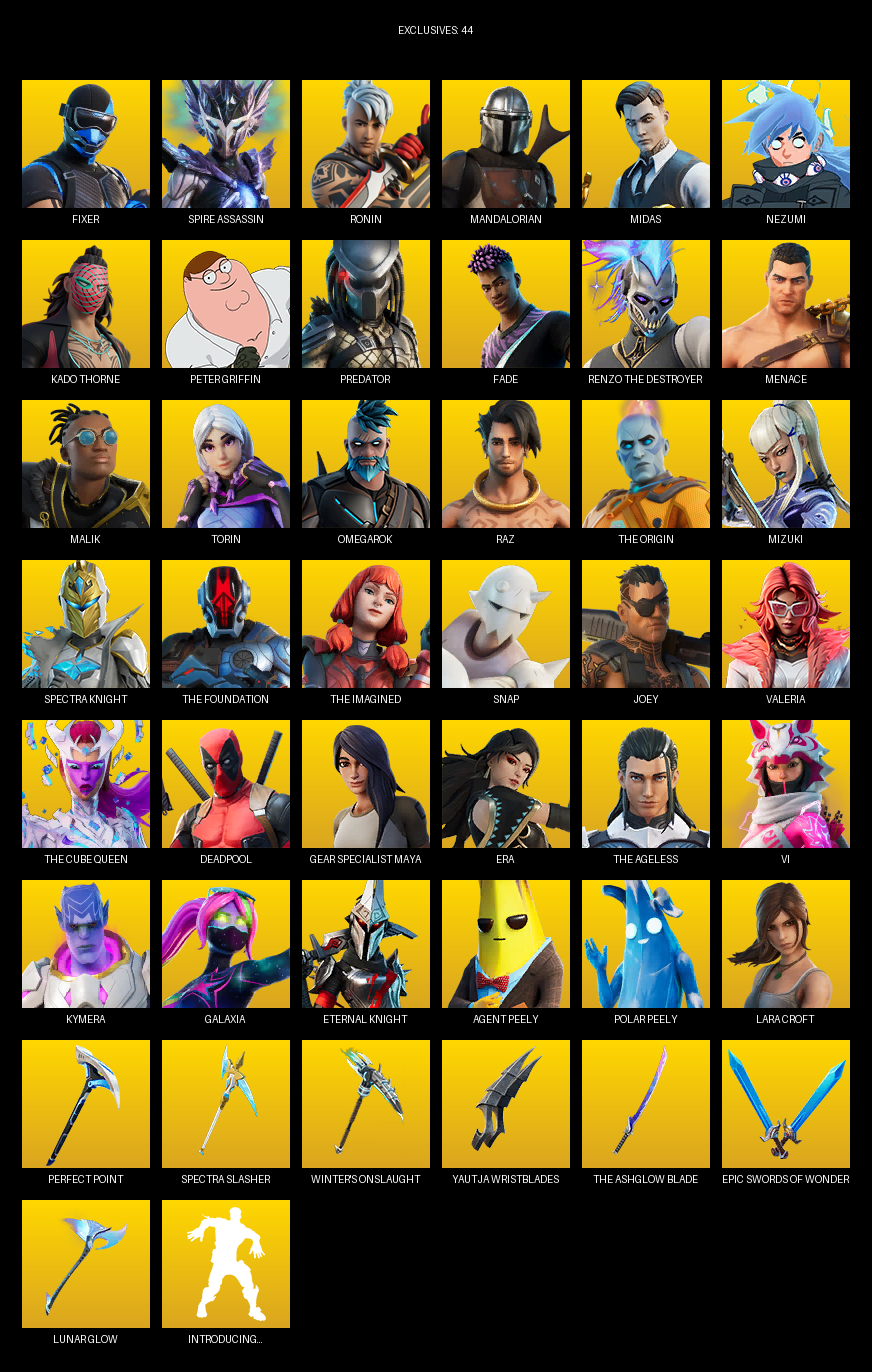 Gear Specialist Maya, Lara Croft, Fixer, Spire Assassin, Ronin, Mandalorian, Midas, Nezumi, Kado Thorne, Peter Griffin, Predator, Fade, Renzo the Destroyer, Menace, Malik, Torin, Omegarok, Raz, Mizuki