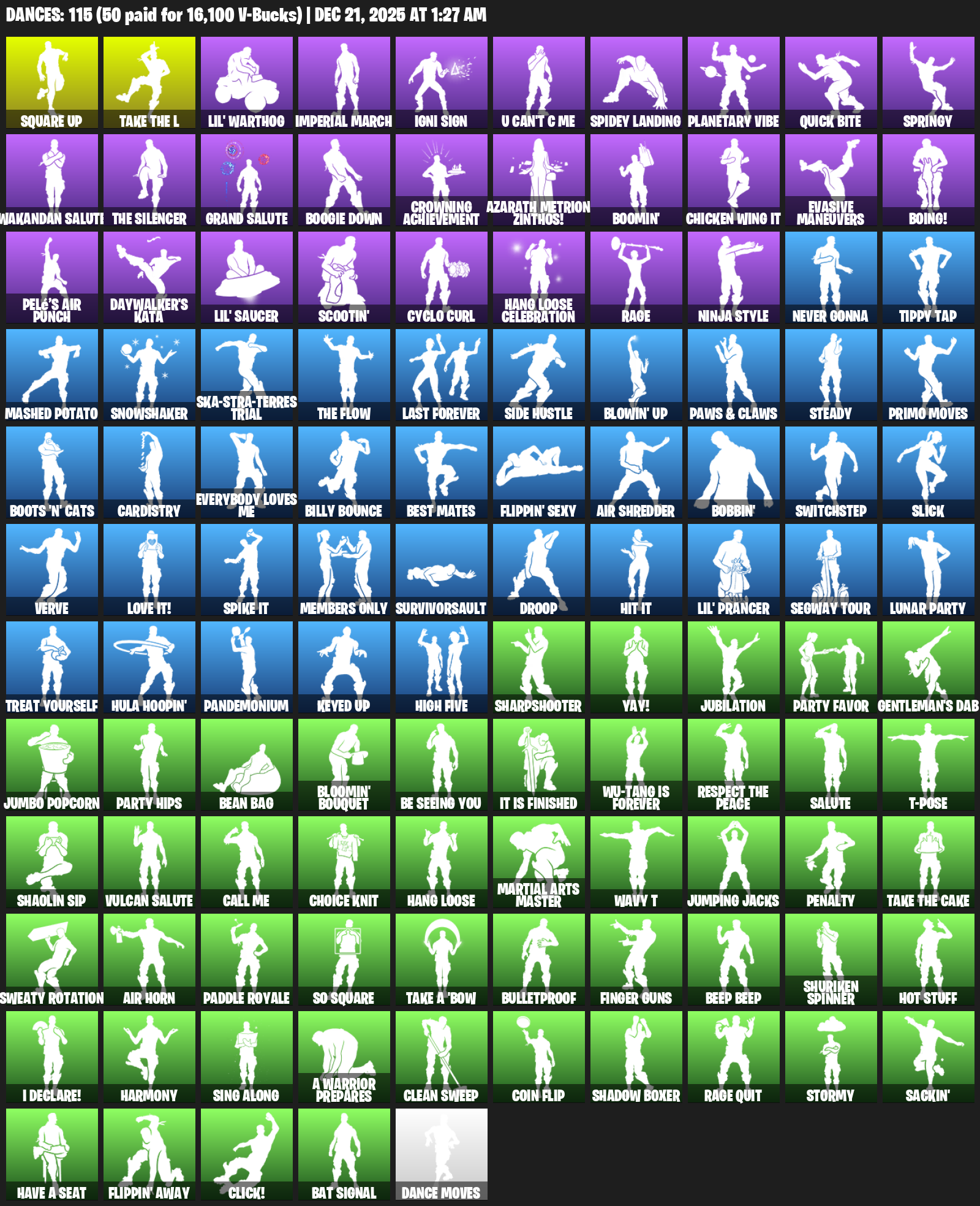 Take The L, Square Up, Lil’ Warthog, Imperial March, Igni Sign, U Can’t C Me, Spidey Landing, Planetary Vibe, Quick Bite, Springy, Wakandan Salute, Boogie Down, Crowning Achievement, Azarath Metrion Zinthos!, Boomin’, Chicken Wing It, Evasive Maneuvers, Boing!