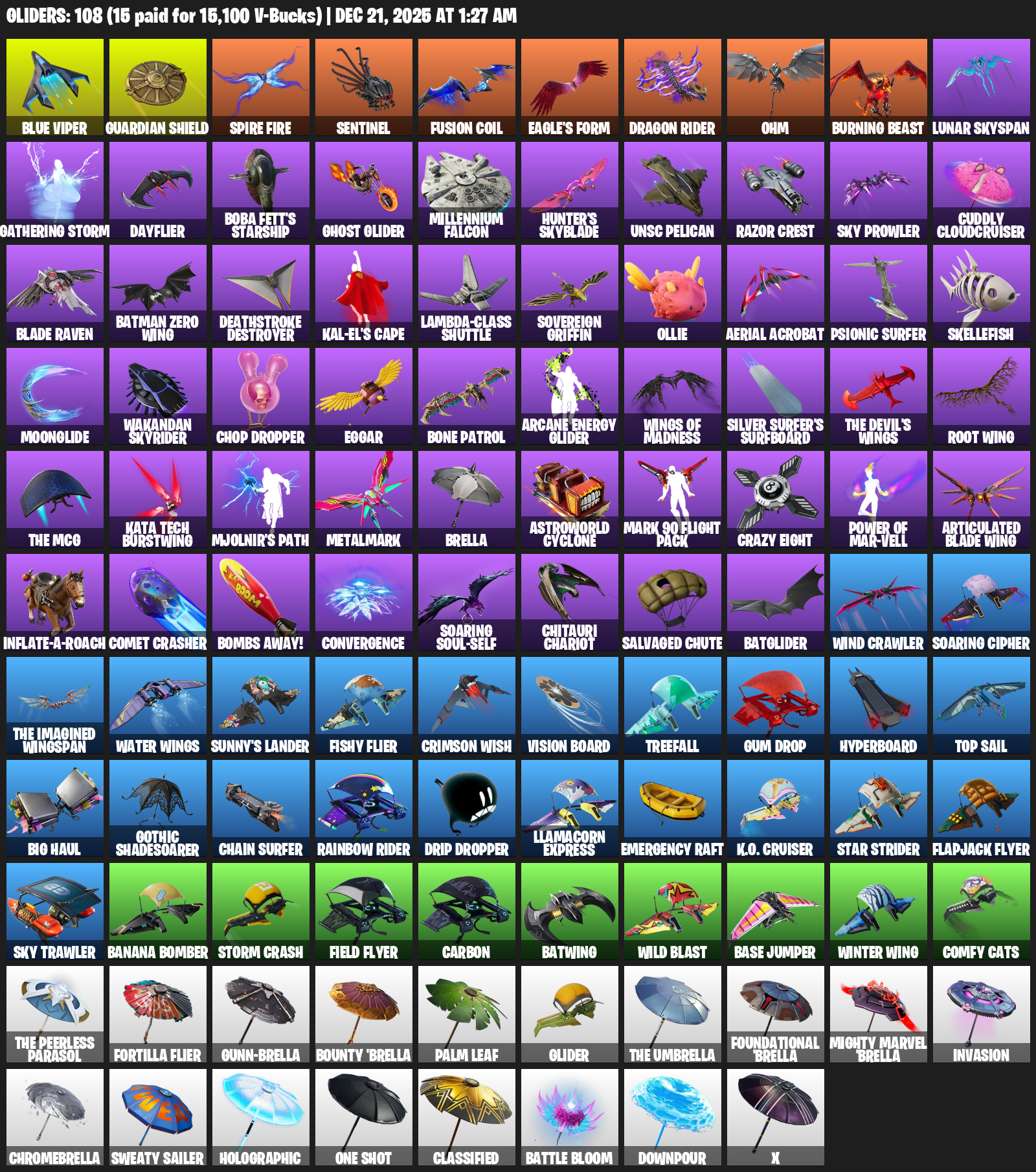 Blue Viper, Sentinel, Fusion Coil, Eagle’s Form, Dragon Rider, Ohm, Burning Beast, Lunar Skyspan, Gathering Storm, Dayflier, Boba Fett’s Starship, Ghost Glider, Millennium Falcon, Hunter’s Skyblade, UNSC Pelican, Razor Crest, Sky Prowler, Cuddly Cloudcruiser