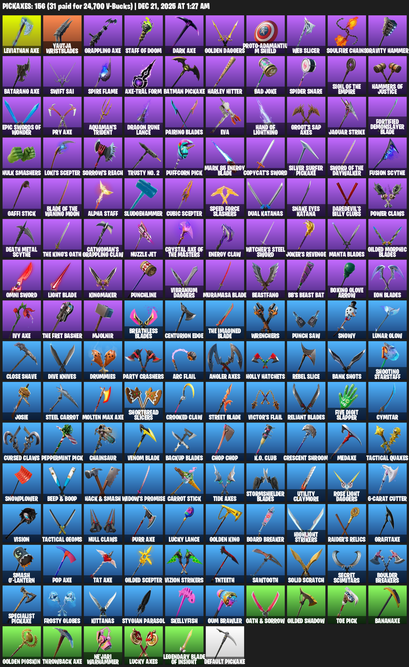 Leviathan Axe, Yautja Wristblades, Staff of Doom, Golden Daggers, Proto-Adamantium Shield, Web Slicer, Soulfire Chains, Gravity Hammer, Swift Sai, Spire Flame, Batman Pickaxe, Harley Hitter, Bad Joke, Spider Snare