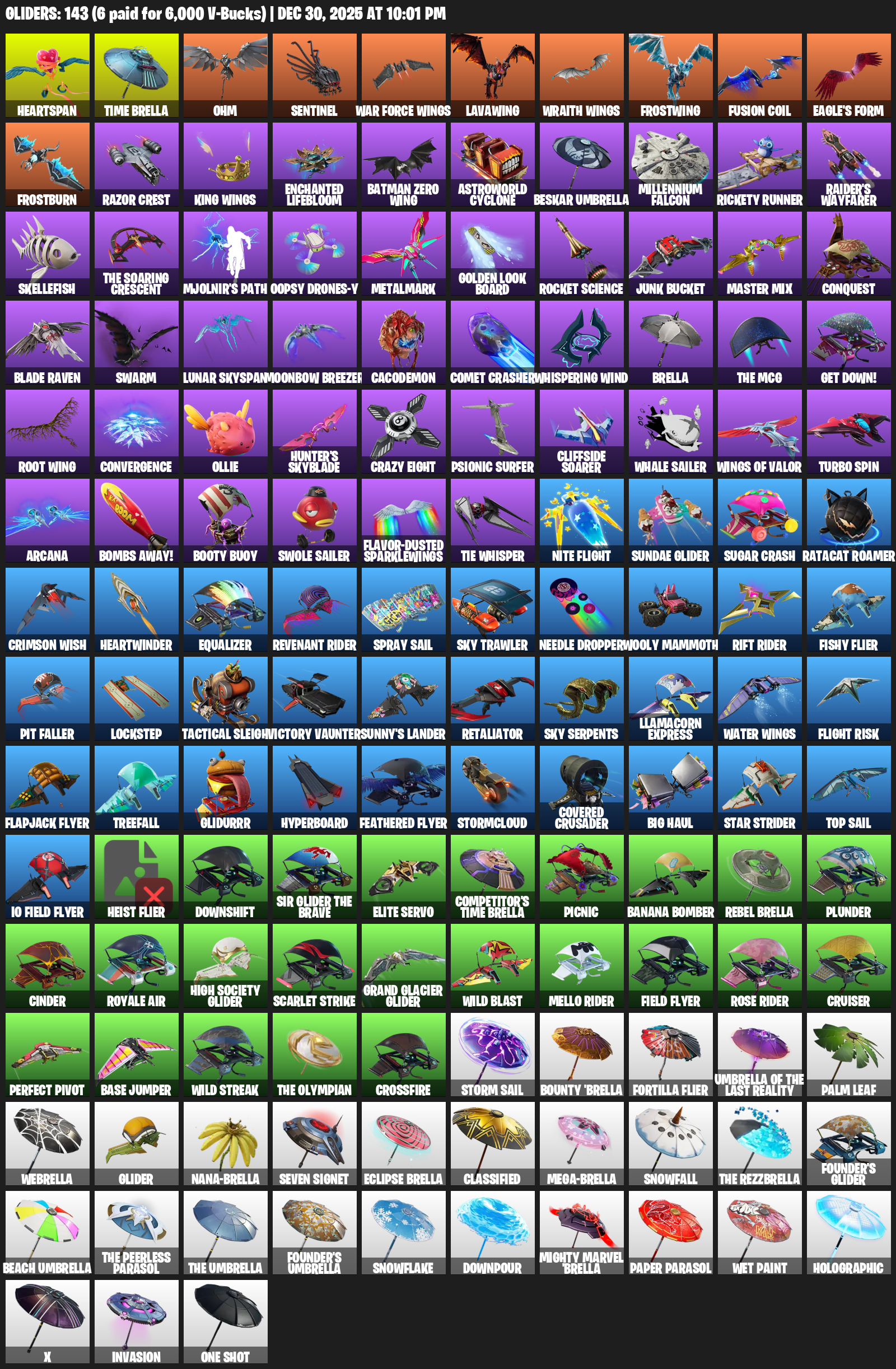 Heartspan, Time Brella, Ohm, Sentinel, War Force Wings, Lavawing, Frostwing, Fusion Coil, Eagle’s Form, Frostburn, Razor Crest, Enchanted Lifebloom, Batman Zero Wing, Astroworld Cyclone, Beskar Umbrella, Millennium Falcon, Rickety Runner, Raider’s Wayfarer
