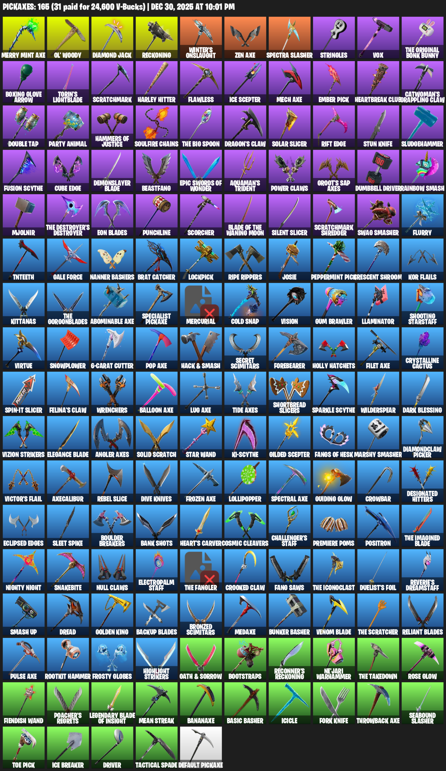Merry Mint Axe, Ol’ Woody, Reckoning, Winter’s Onslaught, Spectra Slasher, Stringles, Vox, Boxing Glove Arrow, Torin’s Lightblade, Scratchmark, Harley Hitter, Flawless, Ice Scepter, Ember Pick, Heartbreak Club, Catwoman’s Grappling Claw